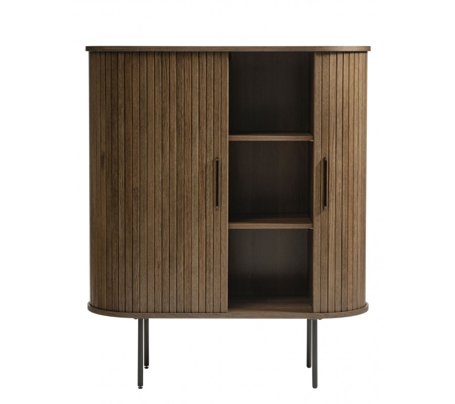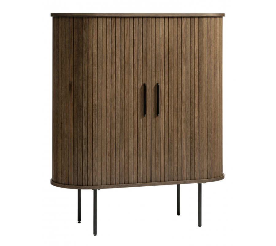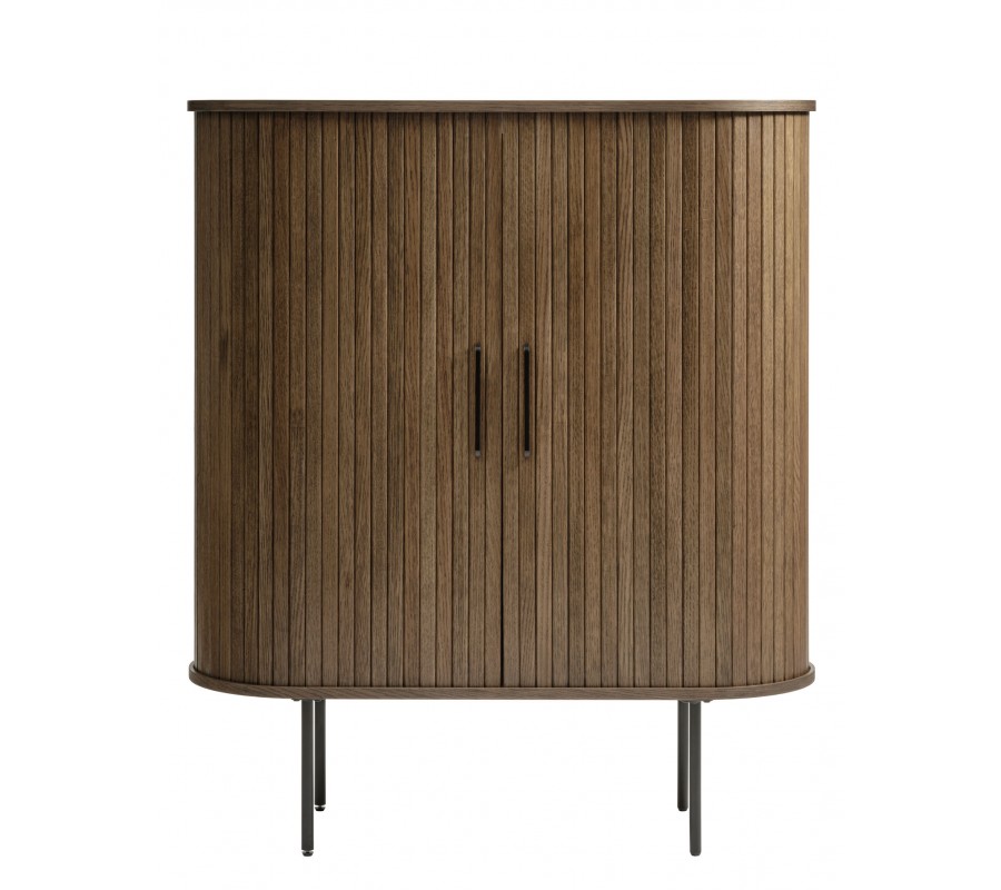 Škandinávska oválna barová skrinka Bornholm v tmavom hnedom dubovom prevedení s posuvnými lamelovými dvierkami 118 cm