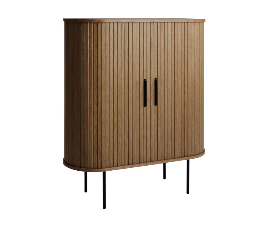 Retro barová skrinka Bornholm oválneho tvaru s posuvnými dvierkami s lamelami v tmavom hnedom dubovom prevedení 118 cm