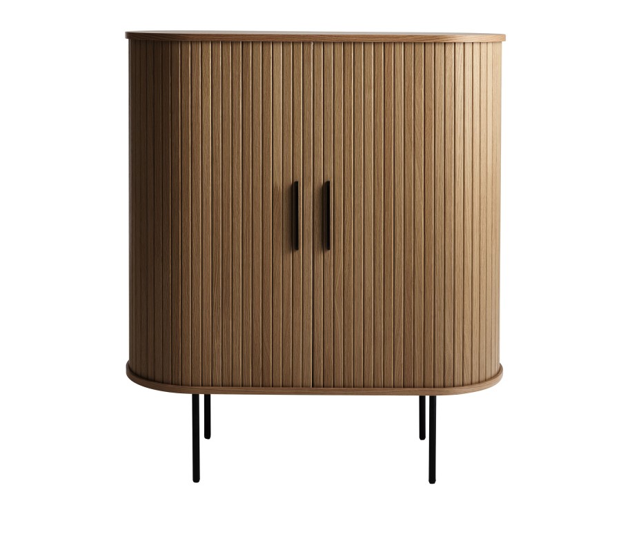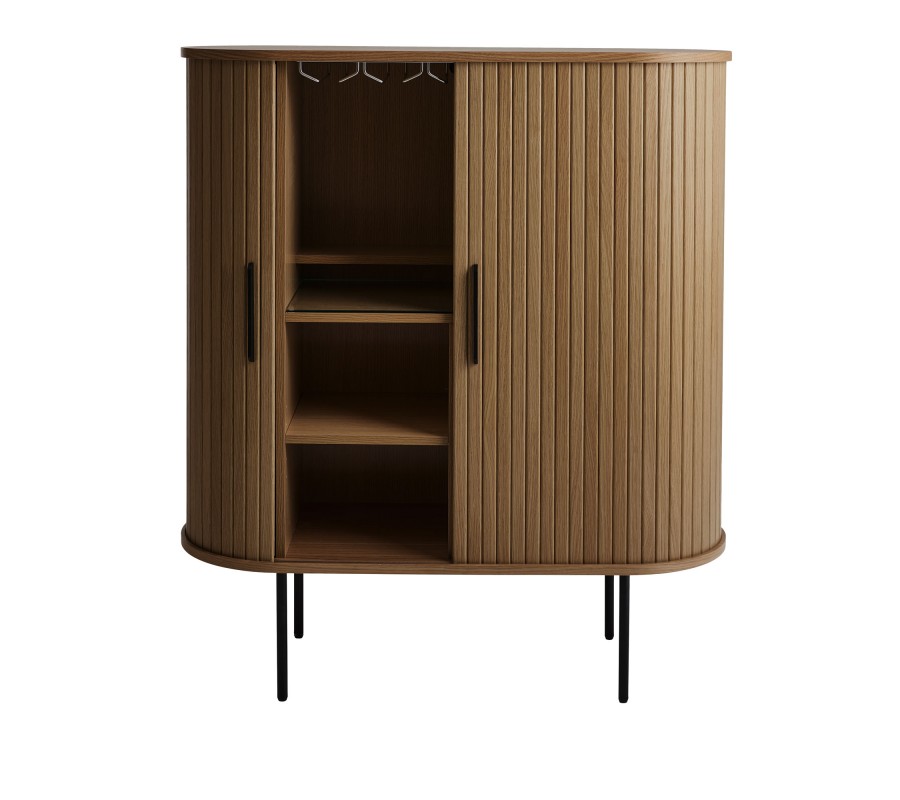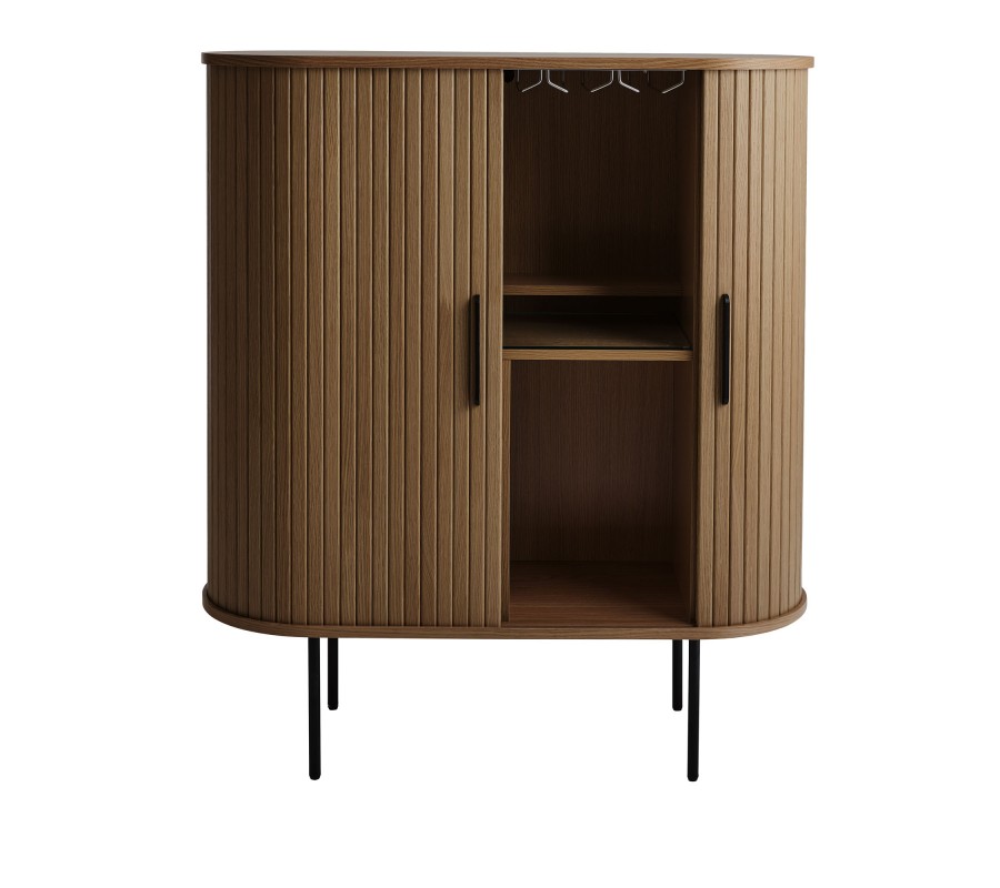 Barová skrinka je vyrobená z kombinácie dubovej dyhy a MDF, čo jej zaručuje pevnosť aj atraktívny vizuál. Má oválny pôdorys s hladkou vrchnou doskou. Obvod korpusu zdobí vertikálny lamelový reliéf, do ktorého sú elegantne integrované posuvné dvierka. Povrchová úprava v tmavej hnedej farbe s priznanou štruktúrou dreva pôsobí teplým prírodným dojmom.
