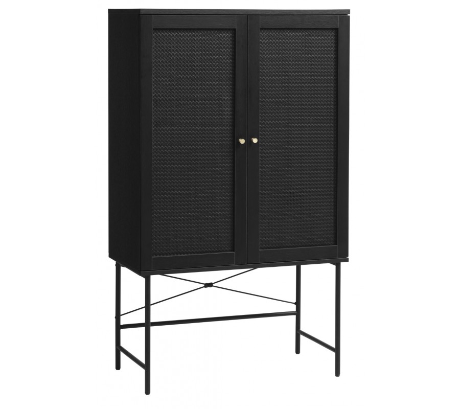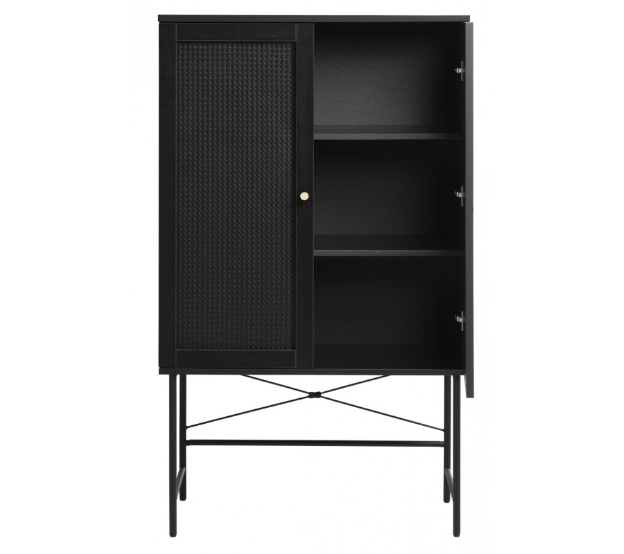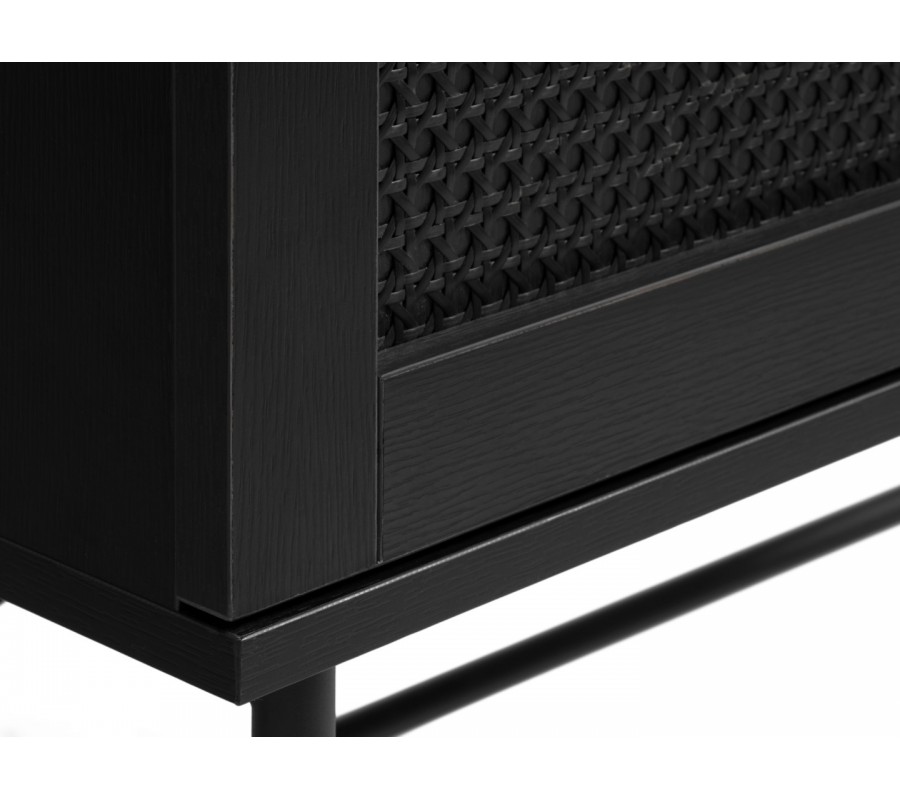 Skrinka je navrhnutá s dôrazom na moderné čisté línie v minimalistickom obdĺžnikovom tvare. Jej korpus je zhotovený z kvalitnej MDF dyhy s čiernou povrchovou úpravou s jemnou kresbou letokruhov, ktorá pôsobí elegantne a nadčasovo. Prednú časť oživujú dvojité dvierka s ratanovým výpletom, ktorého viedenský vzor prináša štýlový retro akcent. Výplet je tiež čierny a ladí tak s drevenými časťami. Vnútorný priestor je prakticky členený na tri policové miesta, vďaka čomu ponúka dostatok miesta na uskladnenie fliaš, pohárov či väčšieho barového vybavenia.