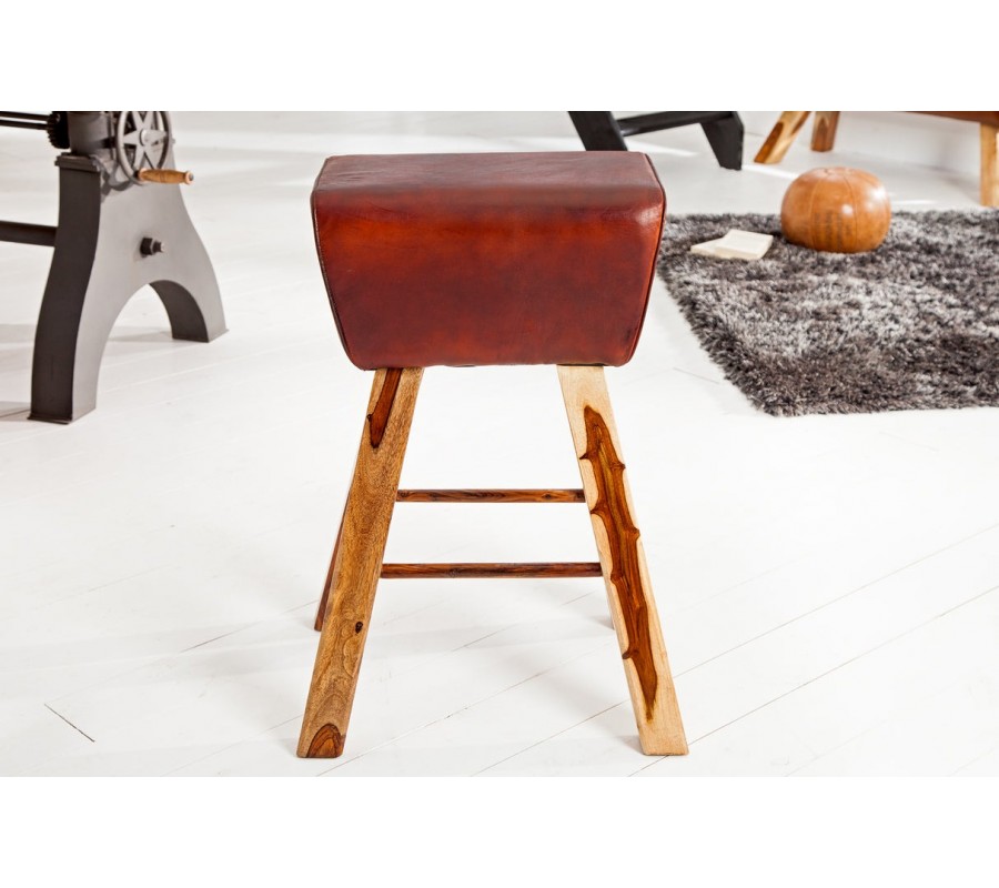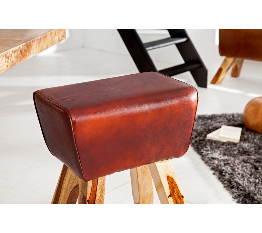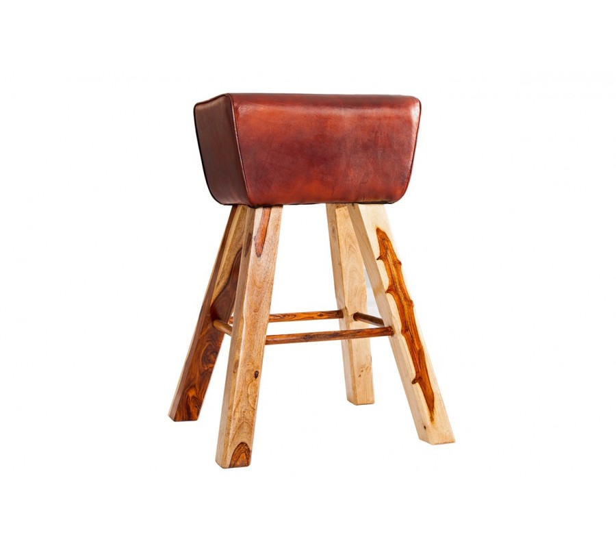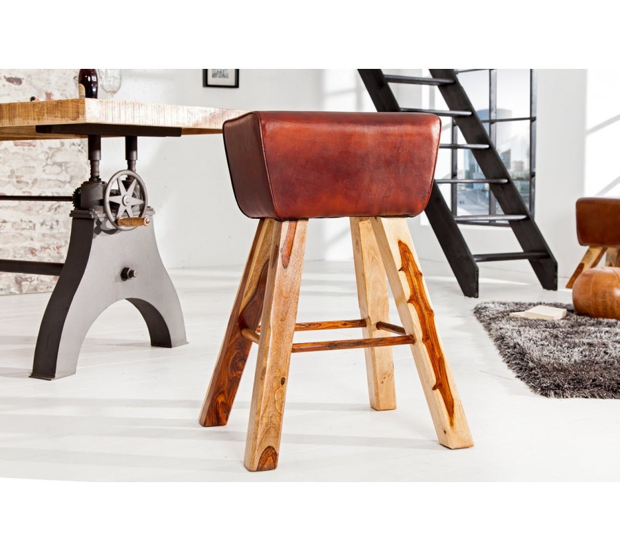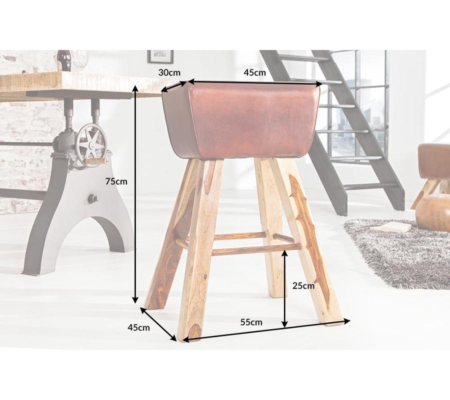 Barová stolička Linda predstavuje originálne prepojenie vidieckeho šarmu, prírodných materiálov a športového retro dizajnu. Jej obdĺžnikové sedadlo bez opierok, poťah v hnedočervenej pravej koži, pripomína tvar gymnastickej kozy, čo jej dodáva výrazný charakter a jedinečný vzhľad.