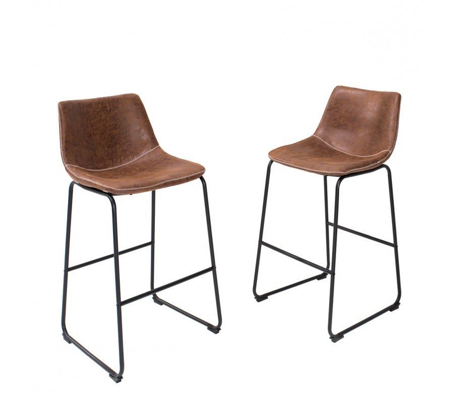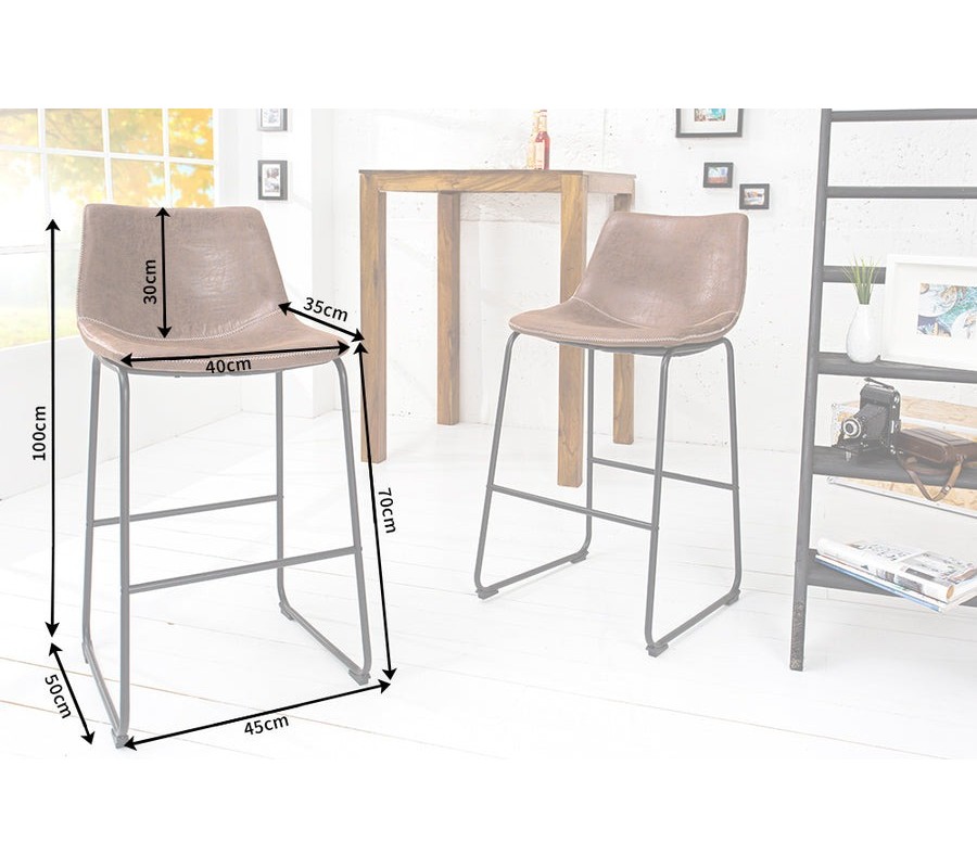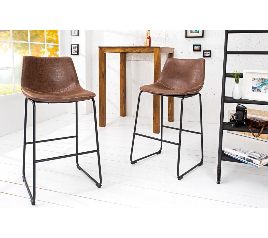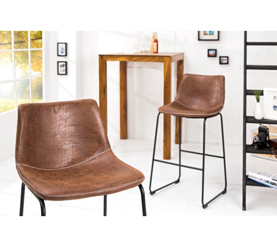 Barová stolička Django spája industriálny štýl s vintage prvkami, vďaka čomu sa stáva výrazným doplnkom do moderných aj rustikálnych interiérov. Sedadlo s operadlom je čalúnené hnedou eko kožou s patinovaným efektom a doplnené o kontrastné biele prešívanie, ktoré lemuje celý obvod sedacej časti a zvýrazňuje jej tvar.