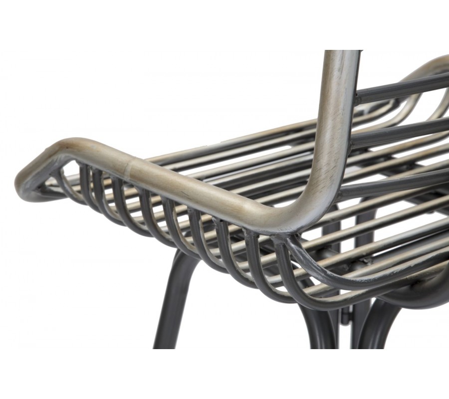 Na prvý pohľad vás zaujme originálny dizajn vrchnej časti. Sedadlo má obdĺžnikový tvar s mierne vyvýšenými bočnými stranami a plynule prechádza do chrbtovej opierky. Okraj lemuje elegantne ohýbaná hrubšia kovová tyč a podobné tenšie tyče tvoria horizontálnu mriežkovanú výplň. Vrchná strana sedadla je pokrytá svetlým lesklým náterom s dizajnovou hnedou patinou, pripomínajúcou hrdzu. Tento detail pôsobí vintage dojmom a zároveň vytvára autentický industriálny vizuál.