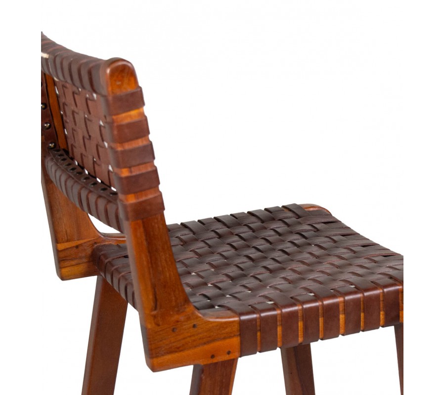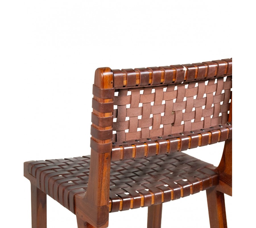 Výrazným prvkom je štvorčekový výplet z hnedej kože na sedadle aj operadle, ktorý je napnutý cez drevený rám. Bočné hrany bez opierok na ruky zachovávajú jednoduchý a kompaktný tvar. Spodná priečna tyč a dve bočné spojovacie tyče zabezpečujú pevnosť a komfort, pričom stredová priečka slúži ako opierka na nohy.