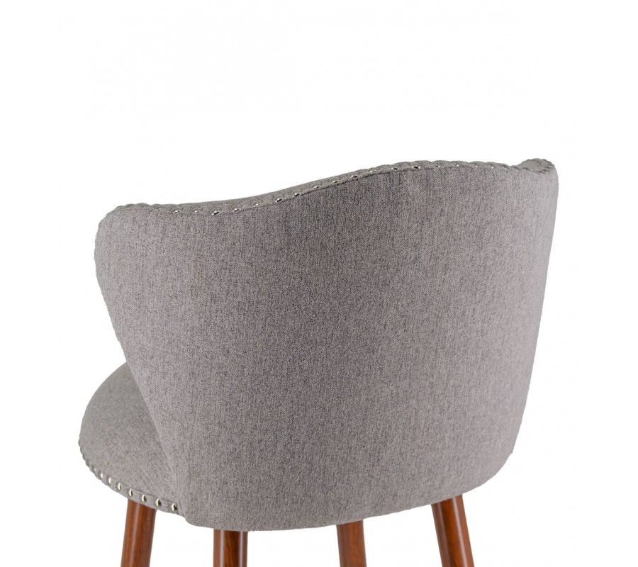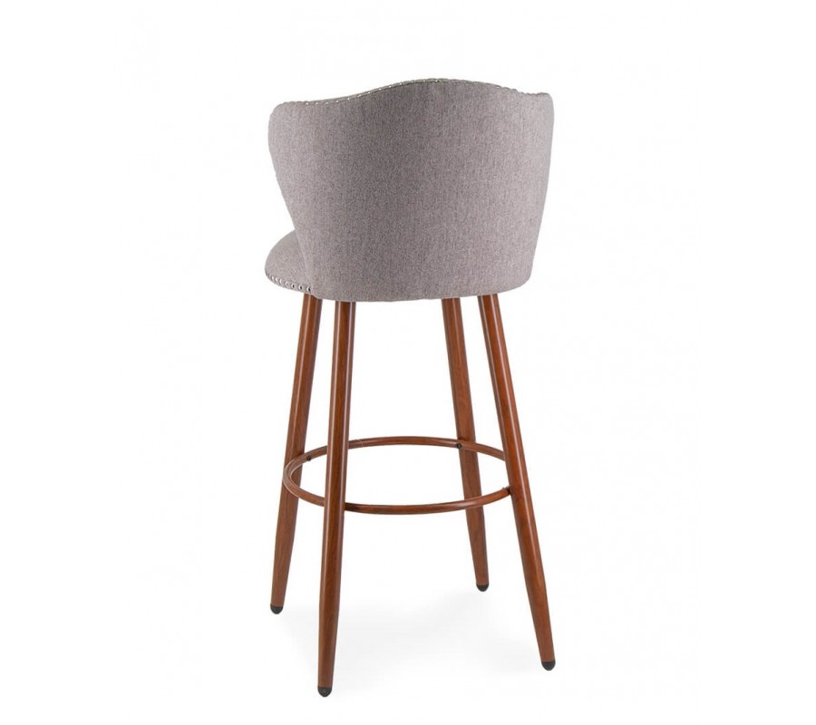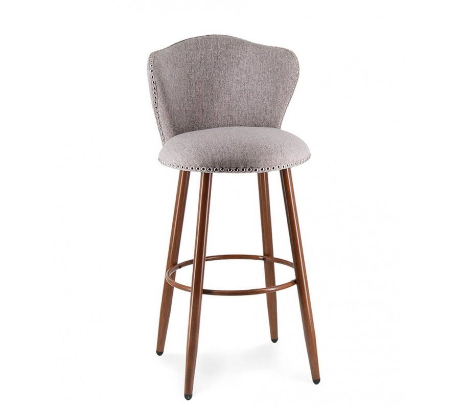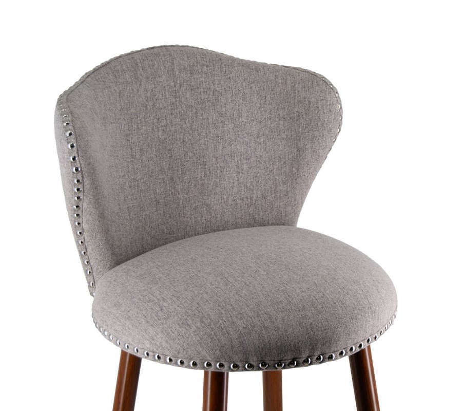 Dizajnová moderná barová stolička Nayla so sivým ľanovým poťahom s vybíjaným zdobením a hnedými nožičkami 102 cm