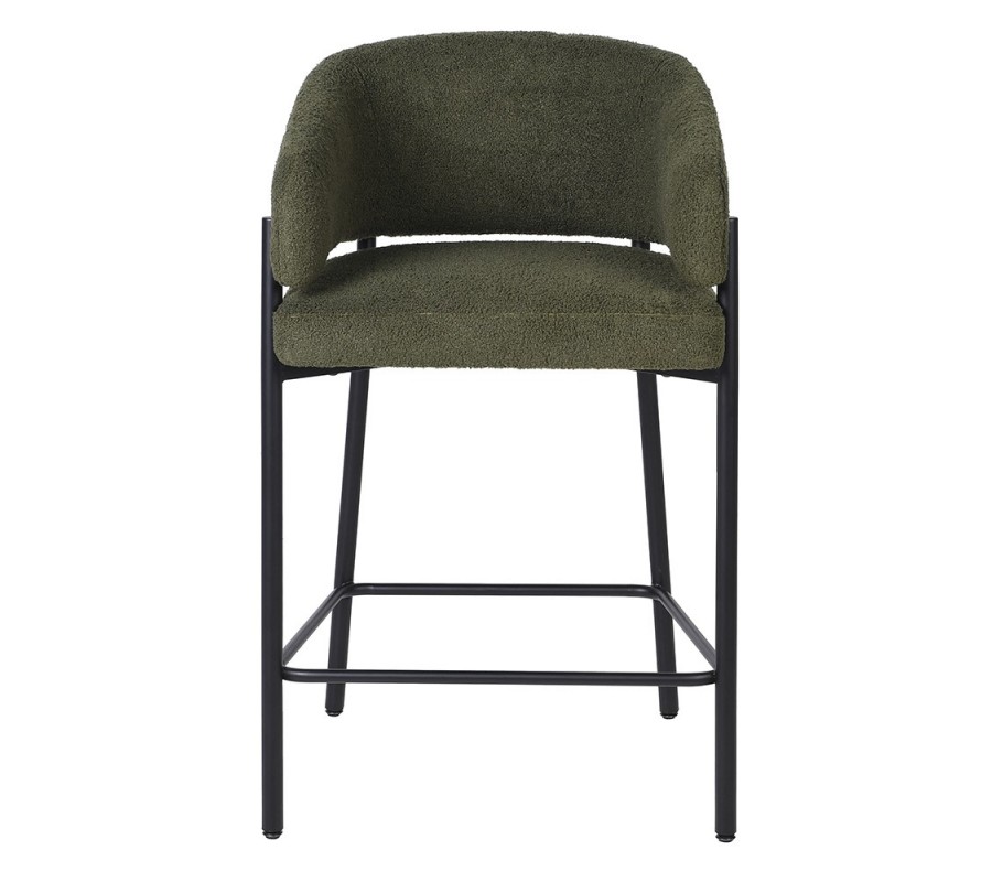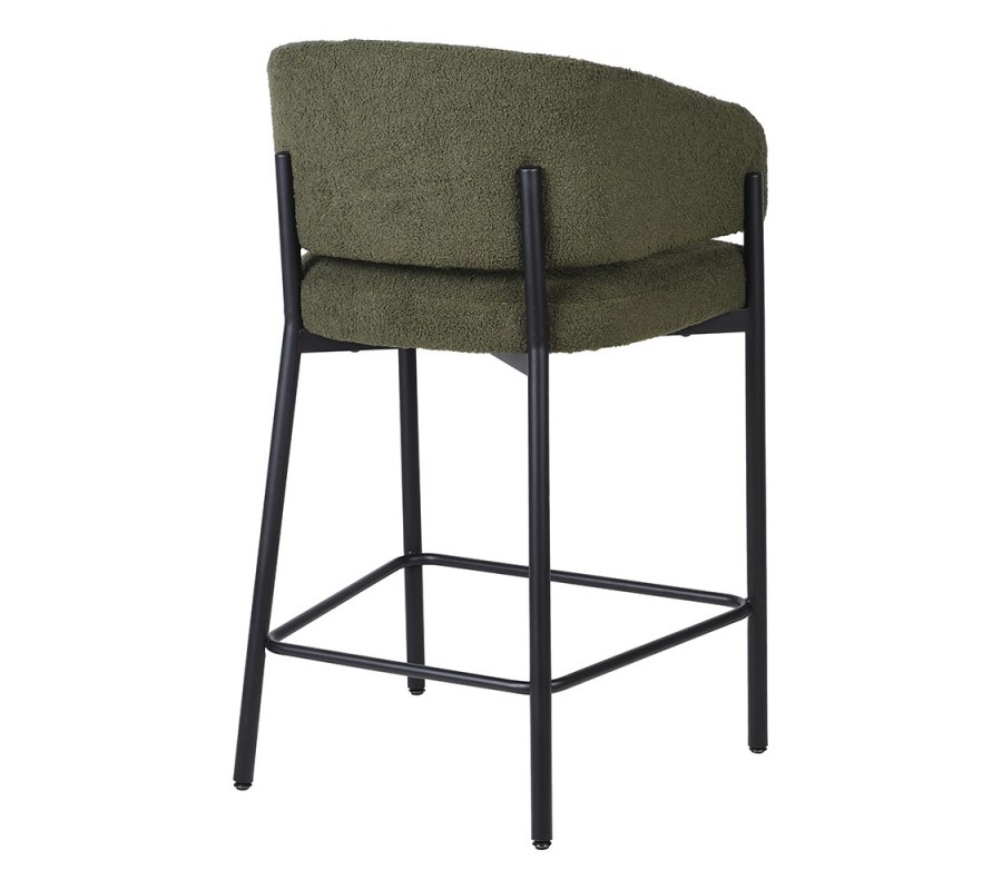 Moderná barová stolička Liora s olivovo zeleným bouclé poťahom a čiernou kovovou konštrukciou 95 cm