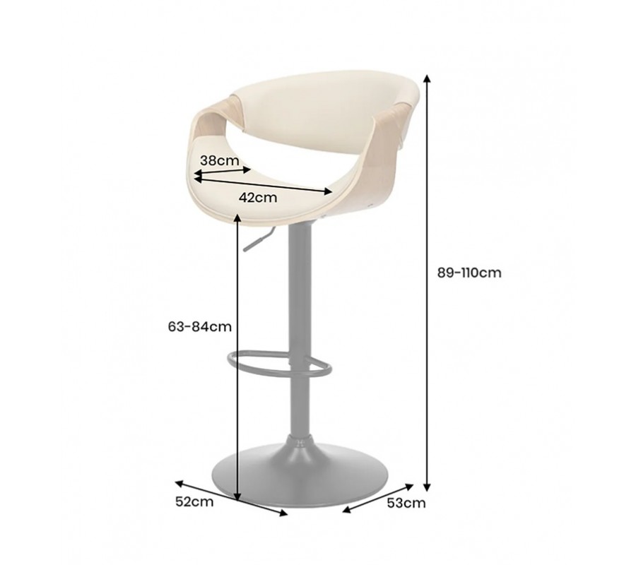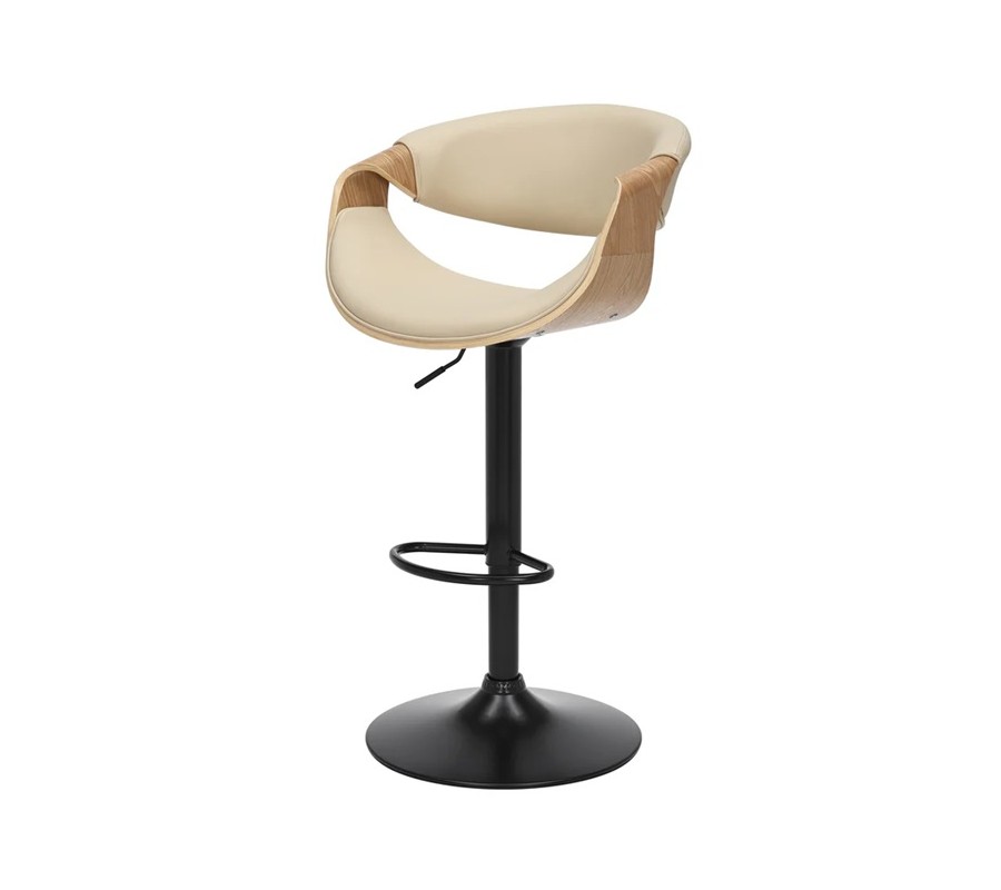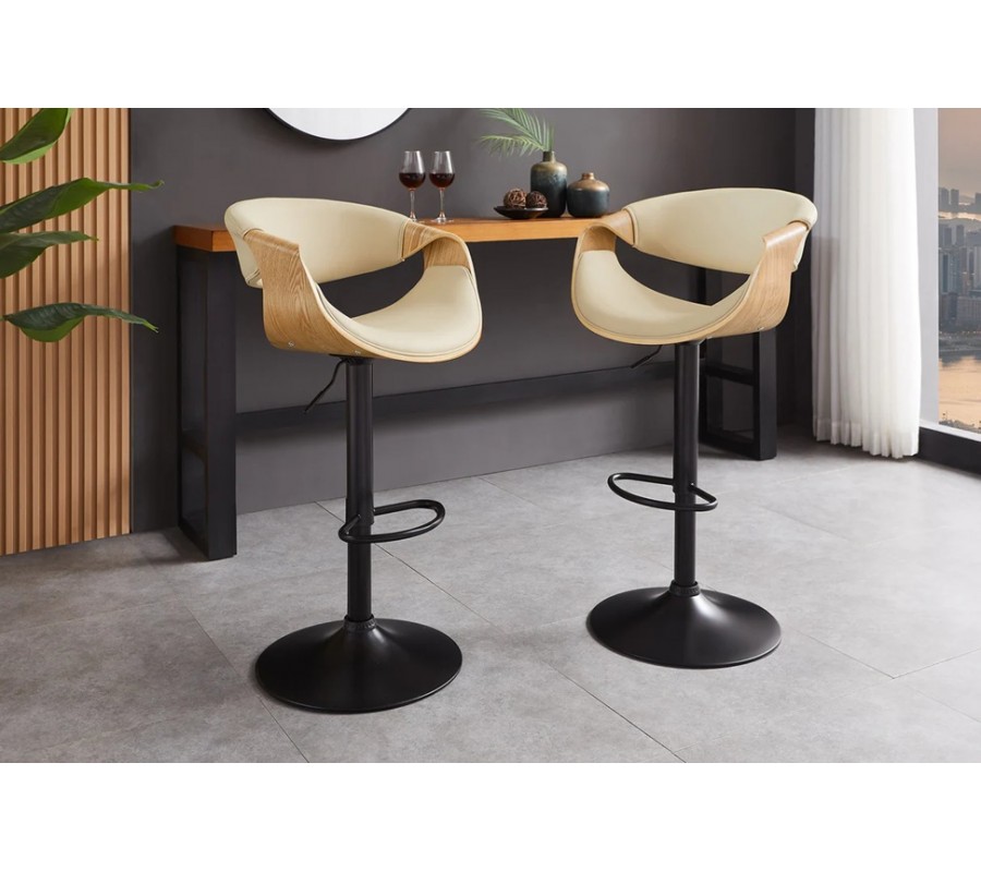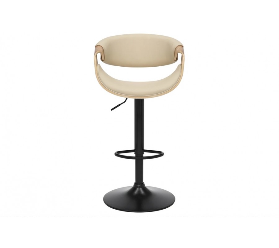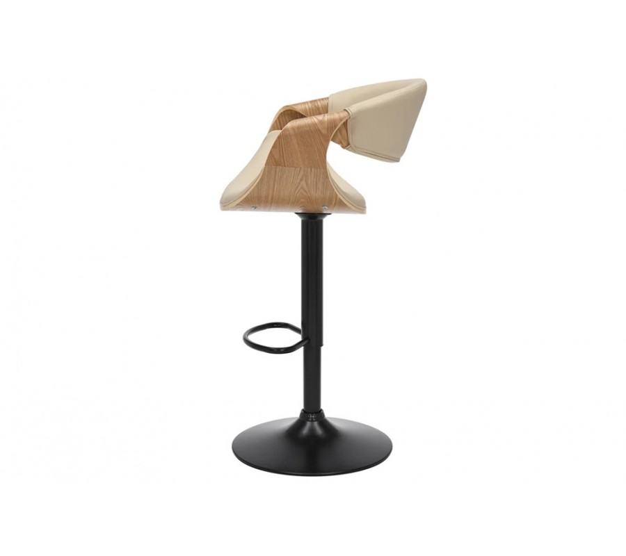 Dizajnová otočná barová stolička Norwich s výškovo nastaviteľnou nohou s krémovým koženým poťahom a hnedou dubovou dyhou 110 cm