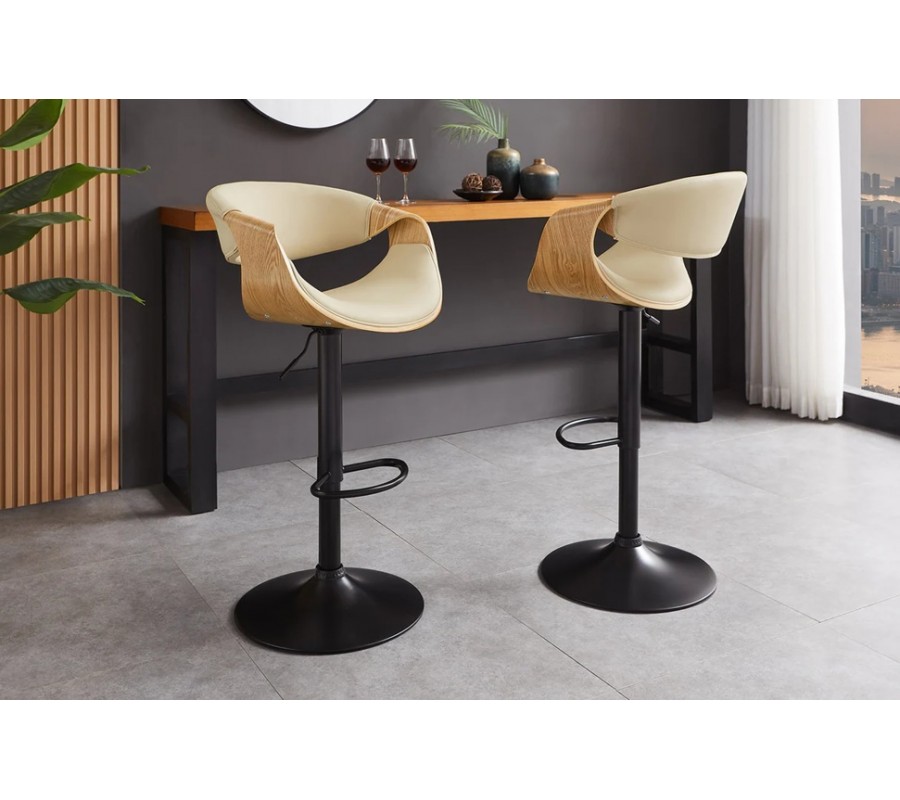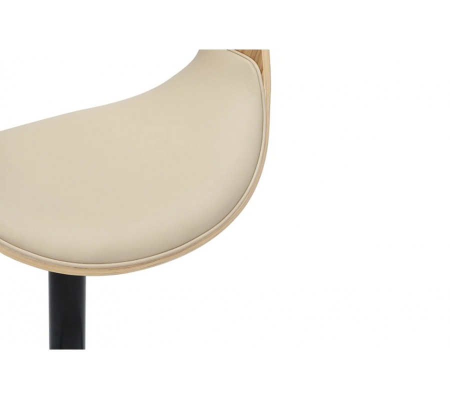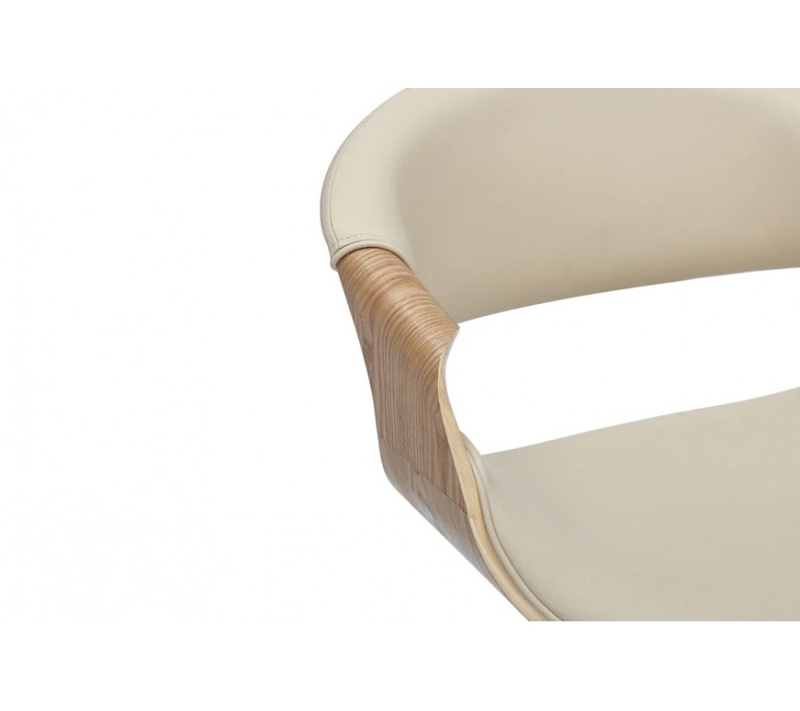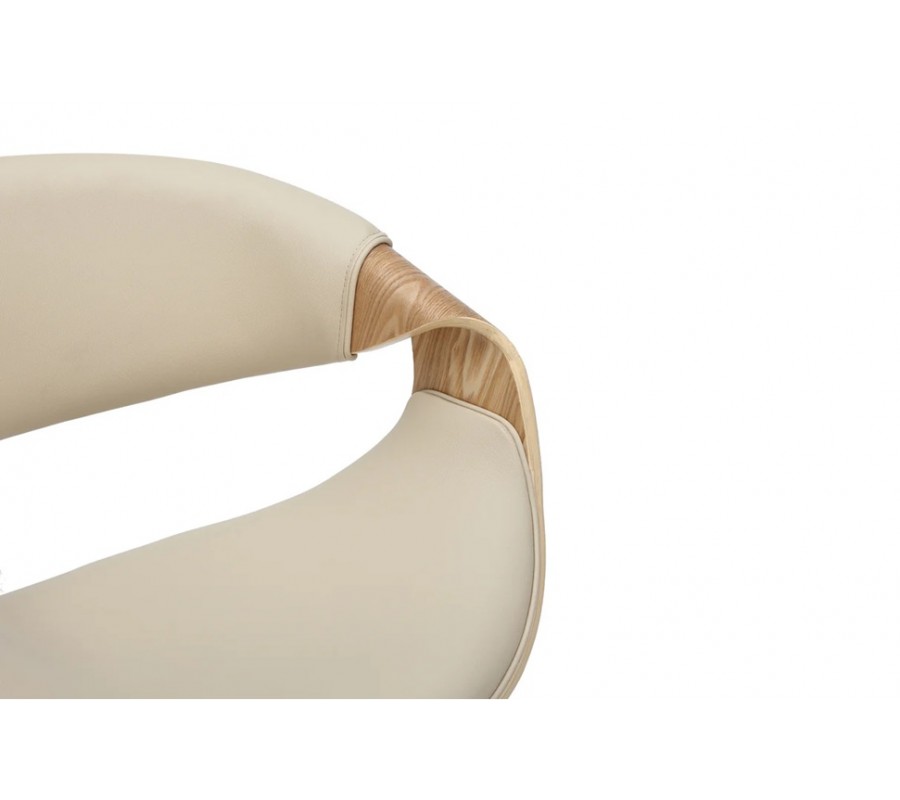 Na prvý pohľad vás zaujme unikátne tvarované sedadlo s konštrukciou z pravej dubovej dyhy v prírodnom svetlom hnedom odtieni s tmavšou kresbou letokruhov. Výrazne prehnutý rám sedadla je na stranách vytiahnutý smerom hore, kde vo výraznom dynamickom ohybe plynule prechádza do chrbtovej opierky. Tá je, rovnako ako aj vrchná časť sedadla, prekrytá čalúnením s poťahom z ekokože v krémovom béžovom odtieni. Táto kombinácia dodáva stoličke harmonický škandinávsky vizuál.