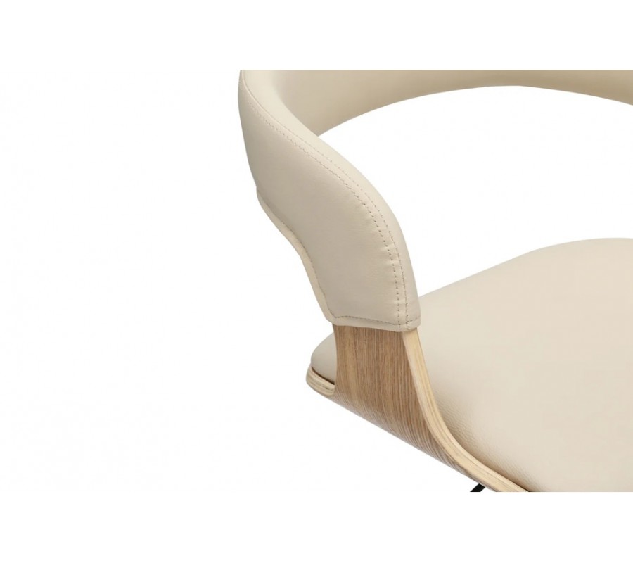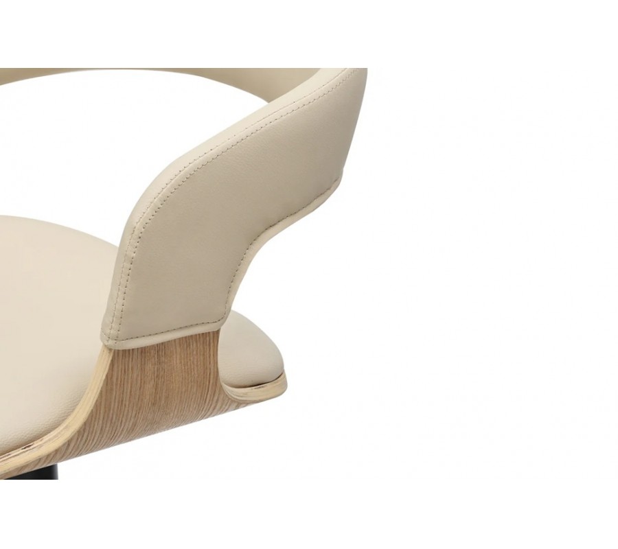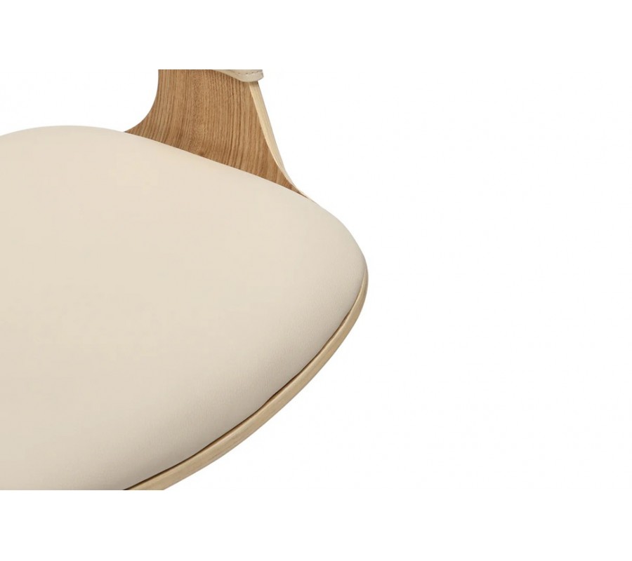 Opierka a aj vrchná časť sedadla sú čalúnené a potiahnuté ekokožou v krémovom béžovom odtieni, ktorý sa krásne prepája s naturálnou dubovou hnedou farbou drevených častí. Svetlá paleta a prírodná kresba letokruhov dodávajú nábytku naturálny pocit tepla, typický pre škandinávsky štýl.