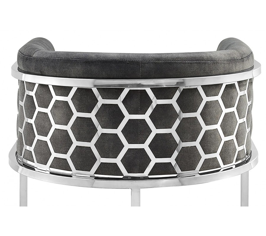Bočná a zadná časť sedacej časti prechádza do nízkeho operadla, ktoré zdobí výrazný geometrický vzor medového plastu v chrómovom prevedení. Tento typický art deco detail dodáva stoličke rytmus a prepracovanú estetiku, no v kombinácii so sivým poťahom pôsobí moderne a neutrálne. Chróm vytvára kontrast k zamatovej textúre, vďaka čomu stoličku ľahko začleníte do rôznych farebných schém.