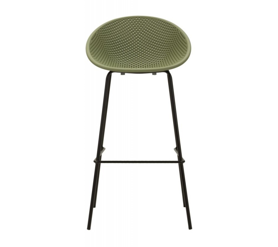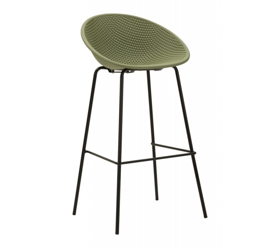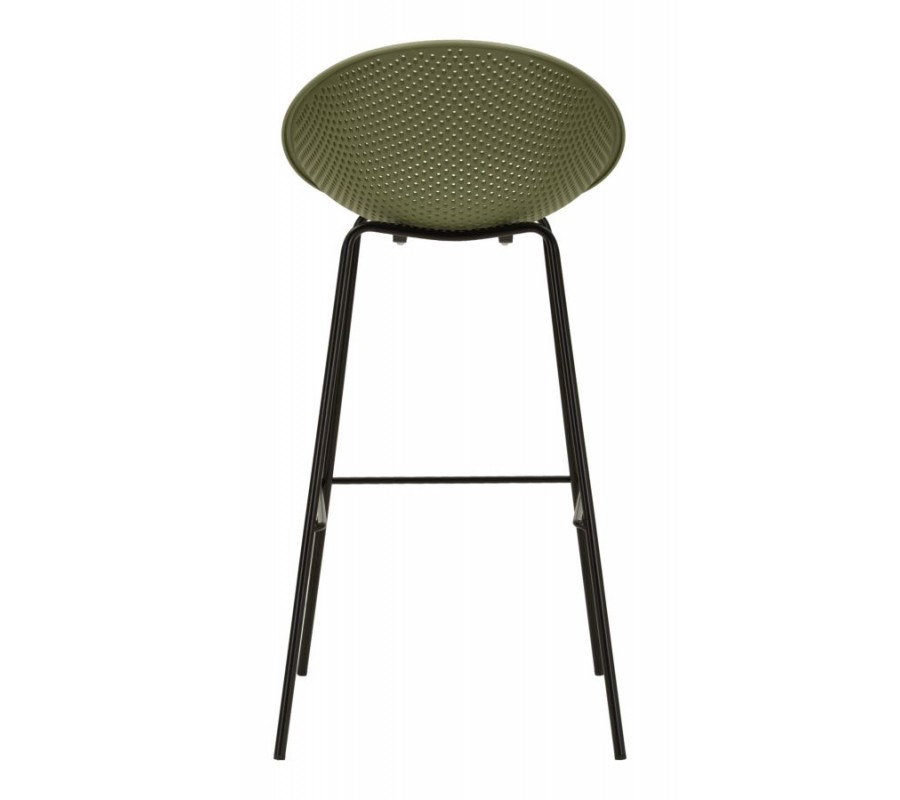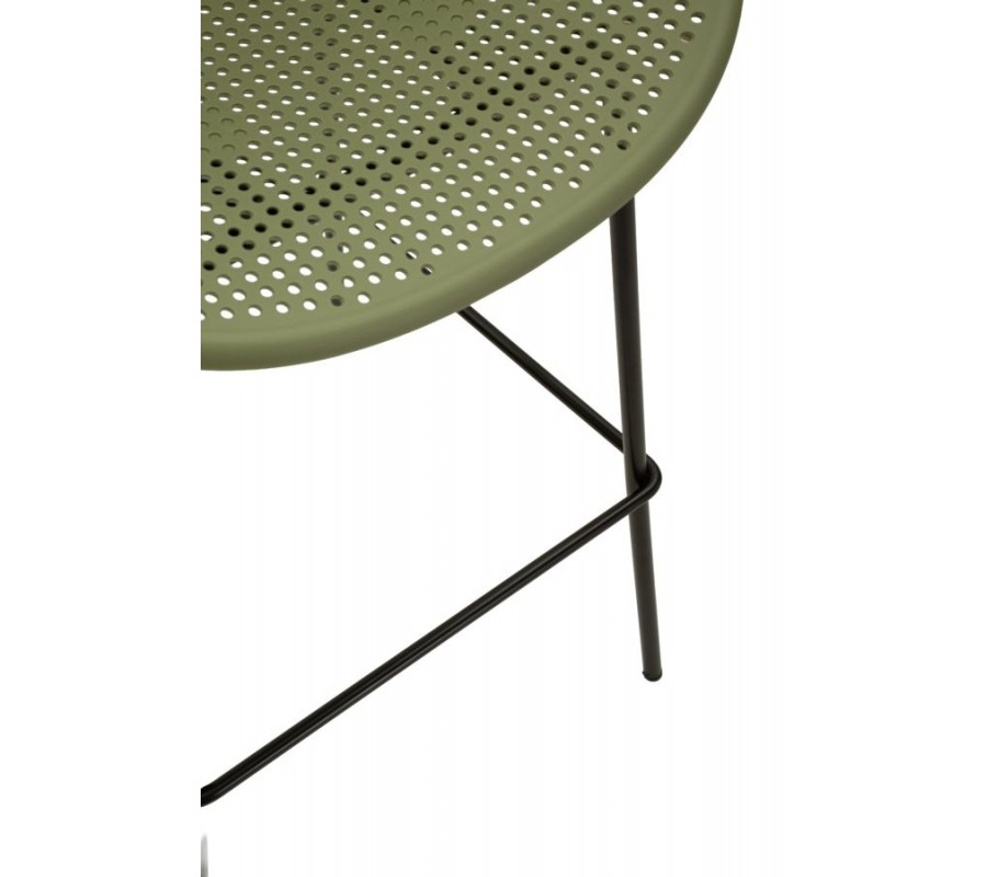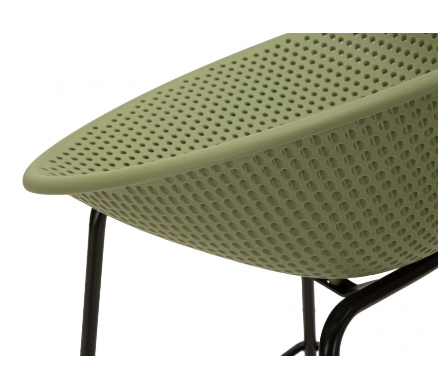 Sedadlo je umiestnené vo výške 78 cm a dopĺňa ho nízka chrbtová opierka, s ktorou tvorí kompaktný celok. Má modernú siluetu s kruhovým rámom a povrchu dodáva vizuálnu štruktúru pravidelná perforácia v podobe drobných kruhových otvorov. Sedacia časť je vyrobená z pevného plastu, ktorý zaručuje odolnosť a nevyžaduje náročnú údržbu. Prevedenie v sýtej zelenej farbe pôsobí výrazne a živo.