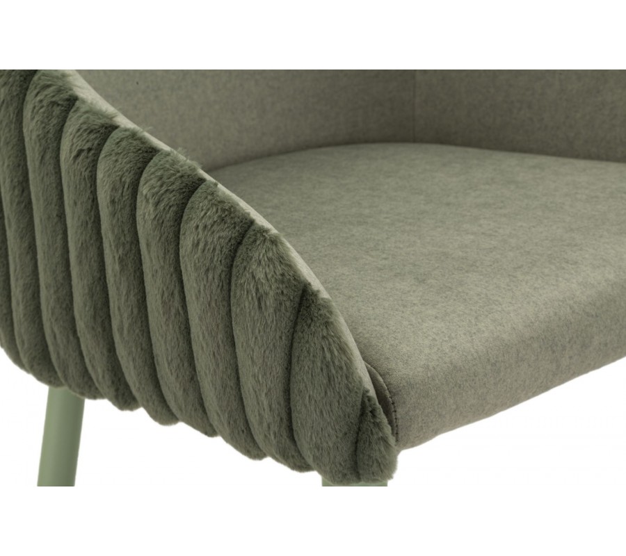 Poťah v šalviovej zelenej farbe pôsobí sofistikovane a harmonicky ladí so svetlým zeleným metalickým prevedením kovových nožičiek. Ich jemný lesk v kombinácii s rebrovaným prešívaním dodáva stoličke art deco výraz. Nohy majú štíhly, valcovitý tvar so zúžením v spodnej časti. Stabilitu zabezpečuje štvorcová výstuha, ktorá zároveň slúži ako praktická opierka na nohy.