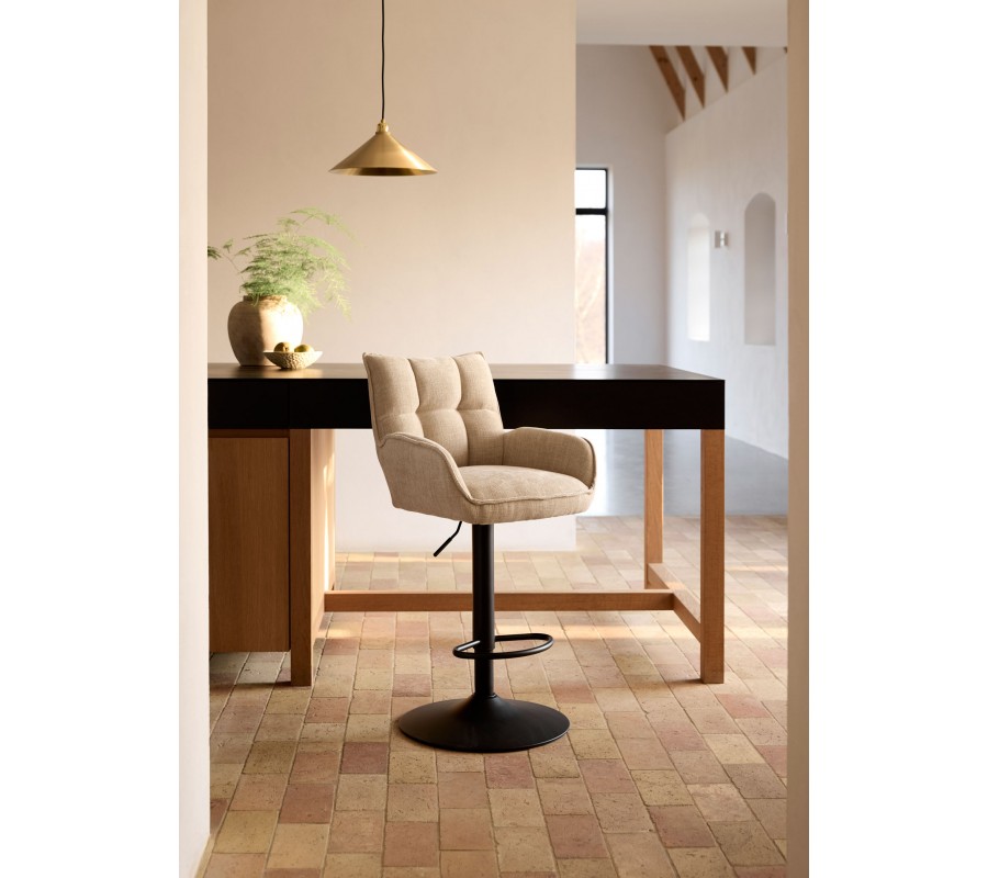 Barová stolička Laerke zaujme moderným vzhľadom, v ktorom sa prepájajú industriálne prvky so škandinávskou harmóniou. Poťah v béžovom odtieni ľanu vnáša do priestru pocit prírodného tepla a oceníte aj nastaviteľnú výšku sedu v rozmedzí od 67 do 82 cm.