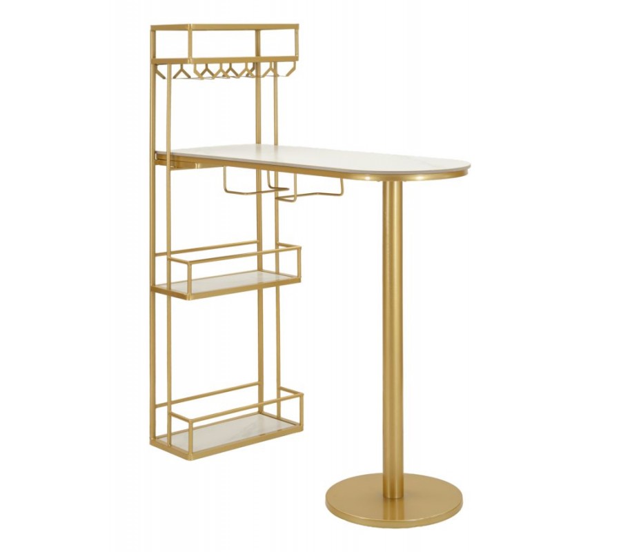 Barový stôl pôsobí kompaktne a multifunkčne. Konštrukcia je vyrobená z kovu v metalickom zlatom prevedení. Lesklý povrch odráža svetlo a v kombinácii so štíhlymi líniami dodáva nábytku vzdušný a odľahčený vizuál. S kovom krásne korešponduje doska z bieleho mramoru, podčiarkujúca luxusný glamour charakter. Zároveň poskytuje pevný, odolný a na údržbu nenáročný povrch.
