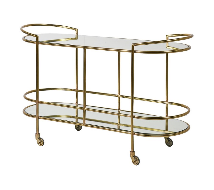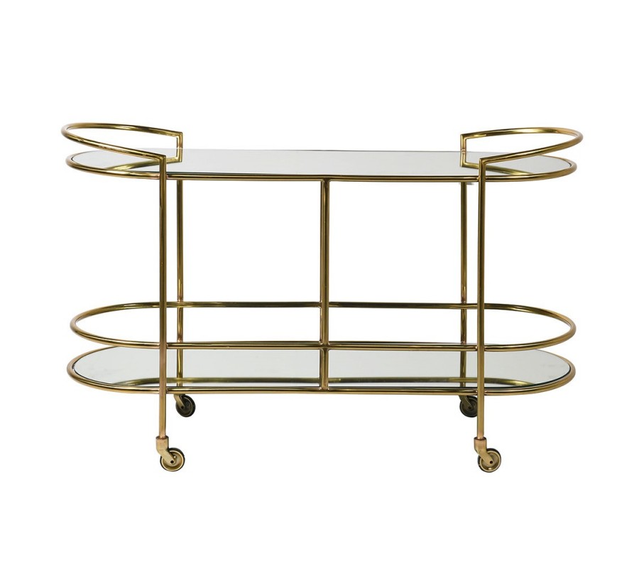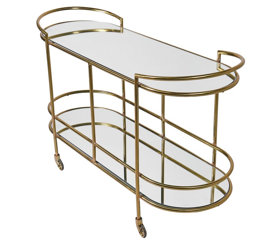 Servírovací vozík má oválny tvar. Odkladaciu plochu zabezpečujú dve police, pokryté zrkadlovým sklom. Sú upevnené v kovovej konštrukcii lesklej zlatej farby. Jej štíhle rovné línie pôsobia moderným a elegantným dojmom. Tvoria ju štyri nožičky ukončené kolieskami. Nižšia polica má kovové zábradlie, ktoré zabraňuje skĺznutiu predmetov. Na bočných stranách vyššej police sú umiestnené zošikmené úchytky pre jednoduchú manipuláciu s vozíkom.