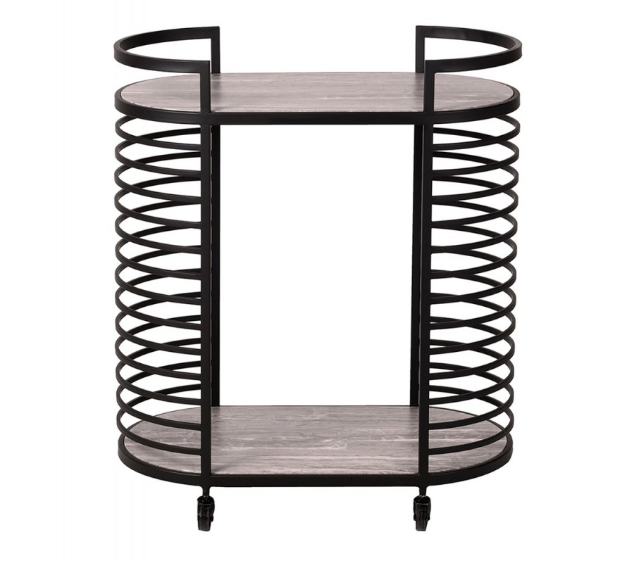 Moderný industriálny oválny servírovací vozík Relos s čiernou kovovou konštrukciou a dvomi hnedými mramorovými policami 76 cm