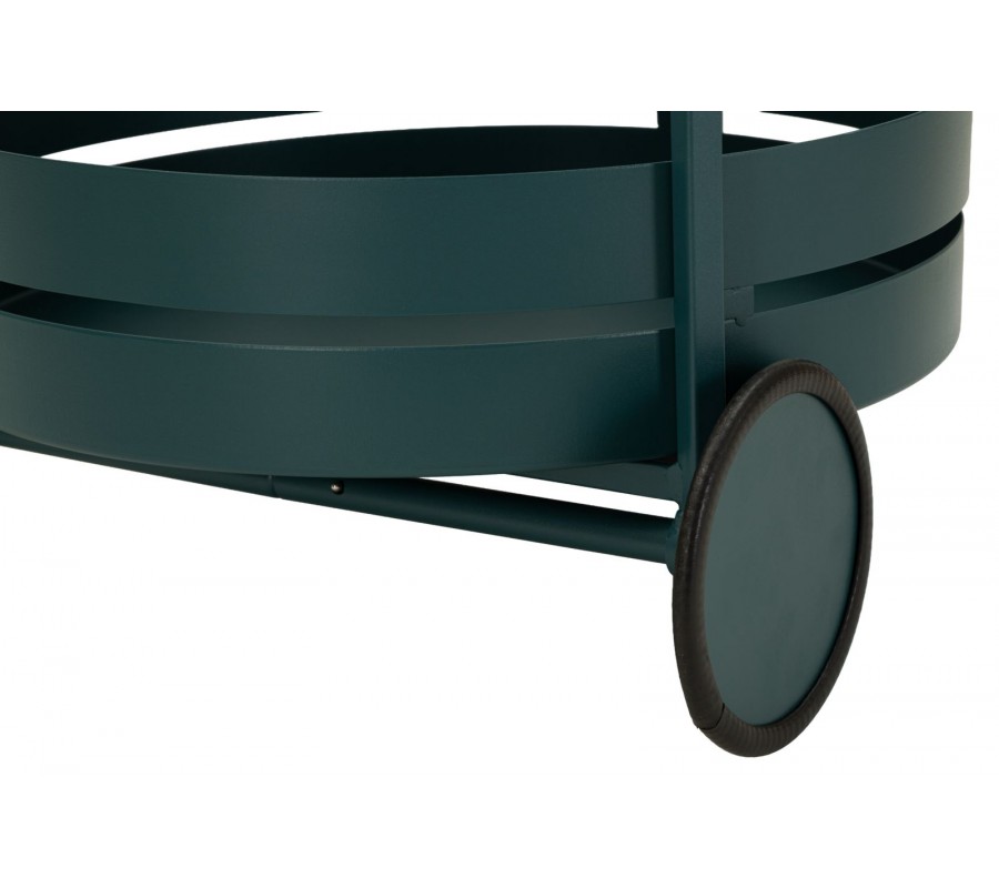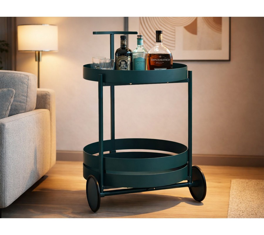Stolík je vybavený dvomi okrúhlymi úrovňami – vrchnou doskou a spodnou policou, obe s jemne vyvýšenými tenkými hranami, ktoré zabraňujú zosunutiu servírovaných predmetov a zároveň podčiarkujú jeho moderný vzhľad. Spodná polica poskytuje dostatok priestoru na fľaše, poháre alebo doplnky. Dve kolieska umožňujú jednoduché presúvanie stolíka a pohodlnú manipuláciu v priestore.
