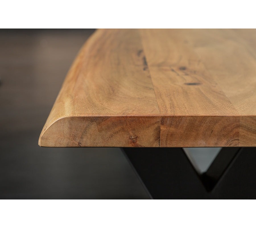 Masívna lavica Mammut v industriálnom štýle ponúka robustné riešenie s prírodným charakterom. Je vyrobená z lakovaného akáciového dreva s hnedým povrchom, ktorý zvýrazňuje výraznú prírodnú kresbu a štruktúru dreva. Obdĺžniková sedacia doska má jemne nepravidelný okraj, čo dodáva lavici autentický vzhľad prírodného masívu.