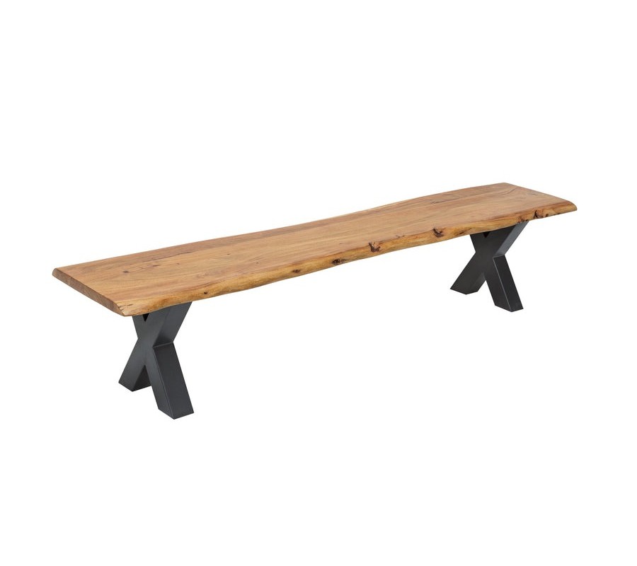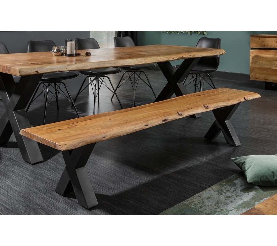 Industriálna obdĺžniková lavica Mammut z lakovaného akáciového dreva s čiernymi kovovými nožičkami v tvare X 160 cm