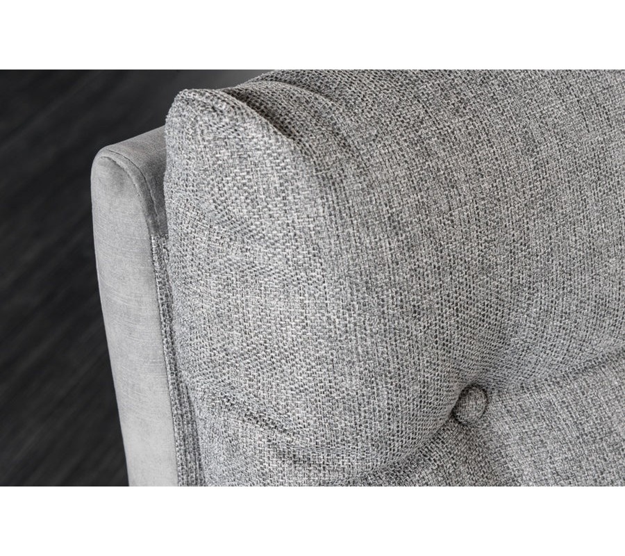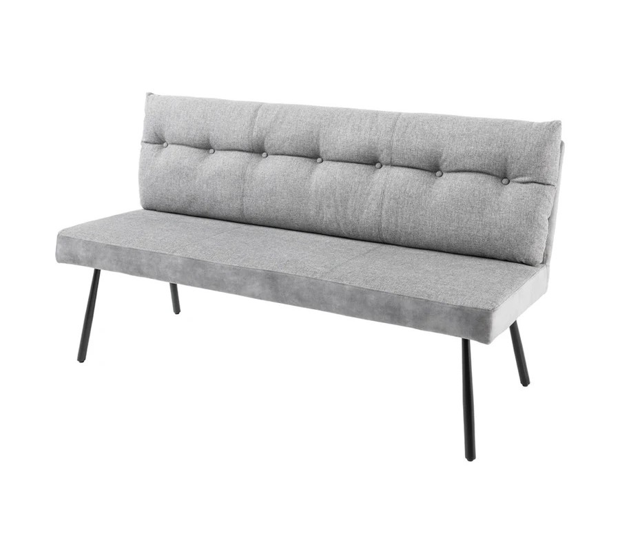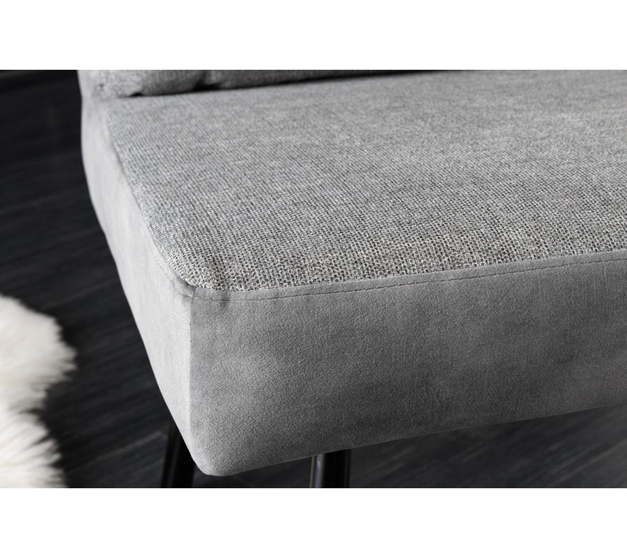 Svetlosivá trojmiestna lavica Harlow má moderný obdĺžnikový tvar a kombinuje industriálny štýl s praktickým čalúnením. Sedadlo a základ operadla sú potiahnuté jemnou zamatovou látkou s decentným leskom, ktorá dodáva celku elegantný charakter. Vrchná plocha sedadla je vyhotovená z hladkej textilnej látky odolnej pri každodennom používaní. Hornú časť operadla tvorí čalúnený textilný vankúš s mäkkou výplňou, ktorý poskytuje pohodlnú oporu chrbta.