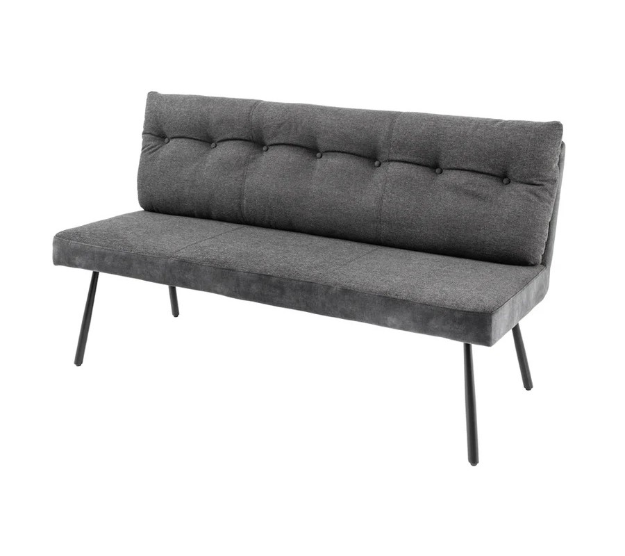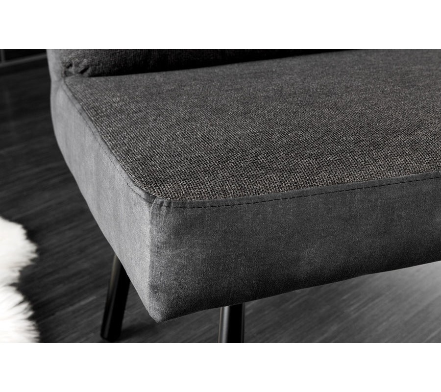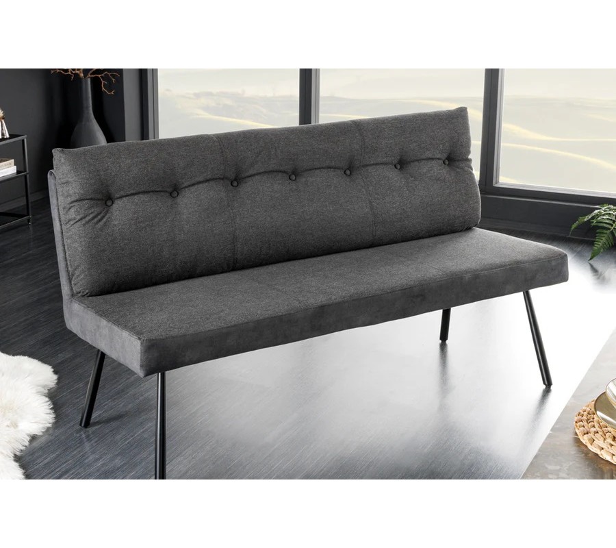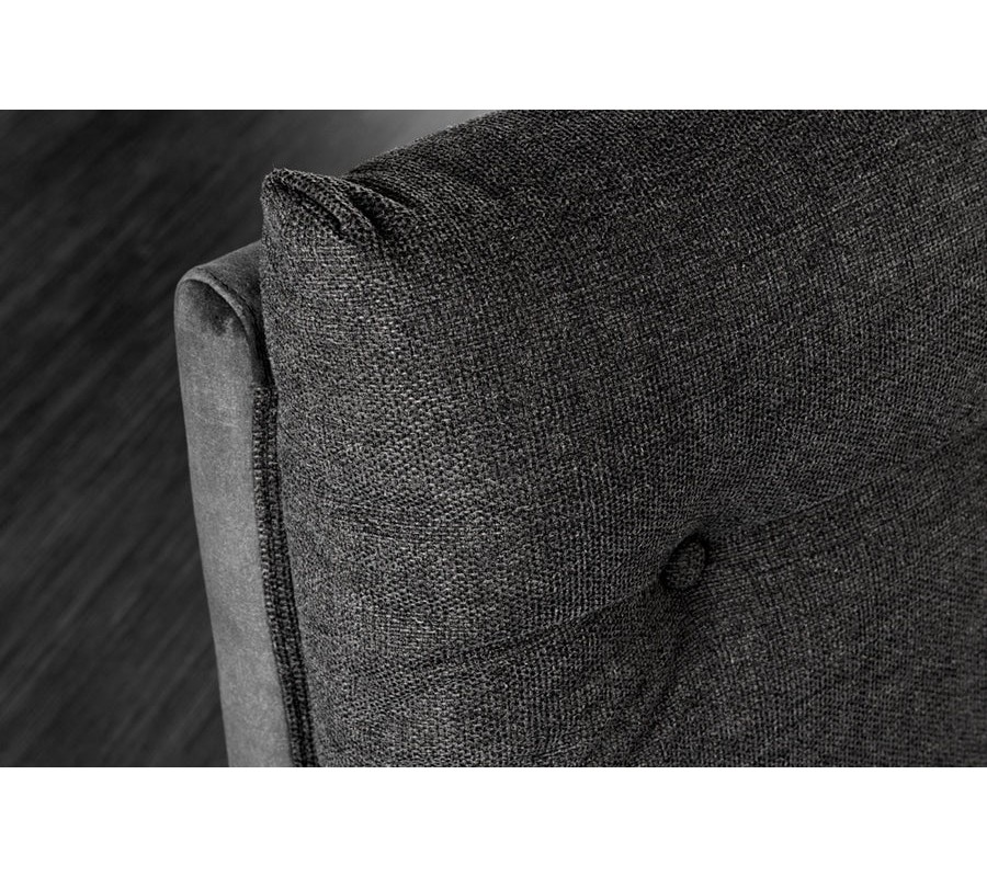 Industriálna trojmiestna lavica Harlow v modernom štýle zaujme svojím jednoduchým obdĺžnikovým tvarom a kombináciou zamatového a textilného poťahu. Vrchná časť sedadla a predná plocha operadla sú potiahnuté tmavosivým zamatom, ktorý pôsobí elegantne a zároveň tlmene, čím dodáva lavici decentný luxusný nádych. Horná plocha sedadla je vyhotovená z odolnej textílie s jemnou väzbou, ktorá pôsobí prirodzene a prakticky pri každodennom používaní. Komfort pri opretí zabezpečuje obdĺžnikový čalúnený vankúš v rovnakej farbe, ktorý je vyrobený z textilu. Vankúš je ozdobený pravidelným prešívaním a radom gombíkov, ktoré vytvárajú retro efekt a zároveň pridávajú na útulnosti. Súčasťou konštrukcie je aj pružinové jadro, ktoré zvyšuje pohodlie pri sedení a zaručuje dlhú životnosť.