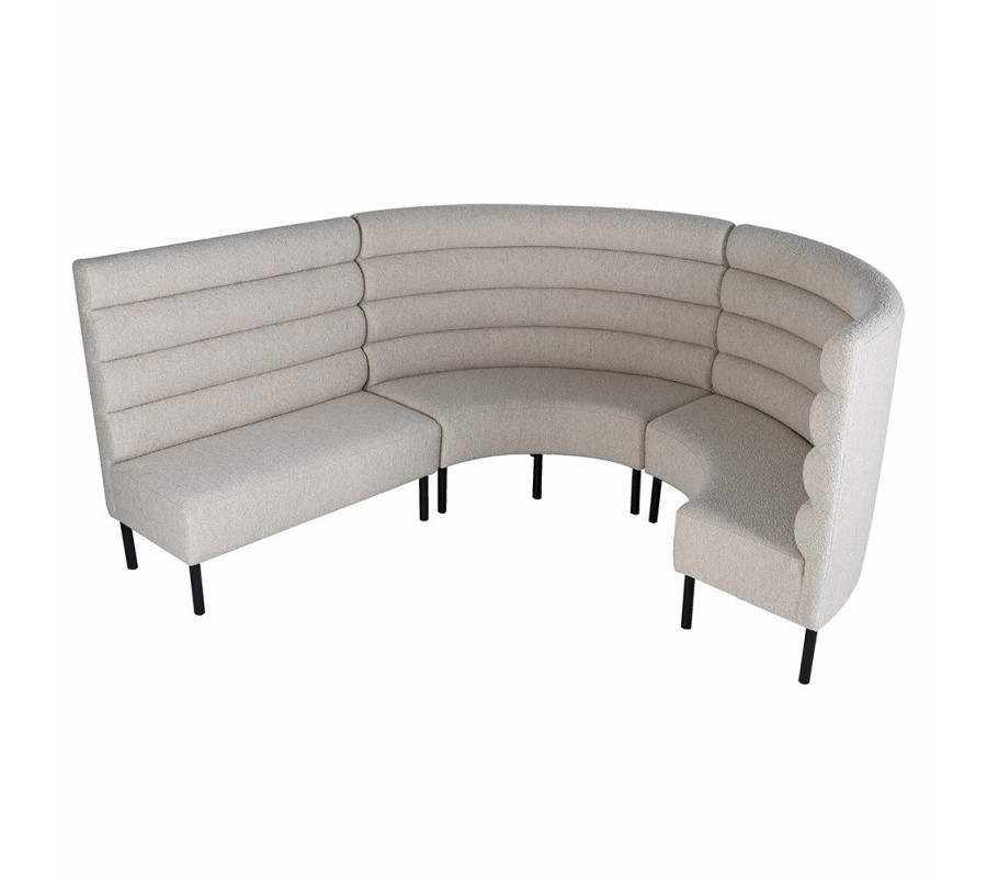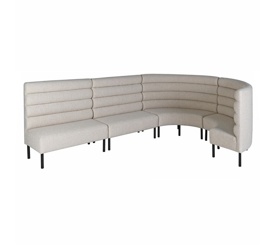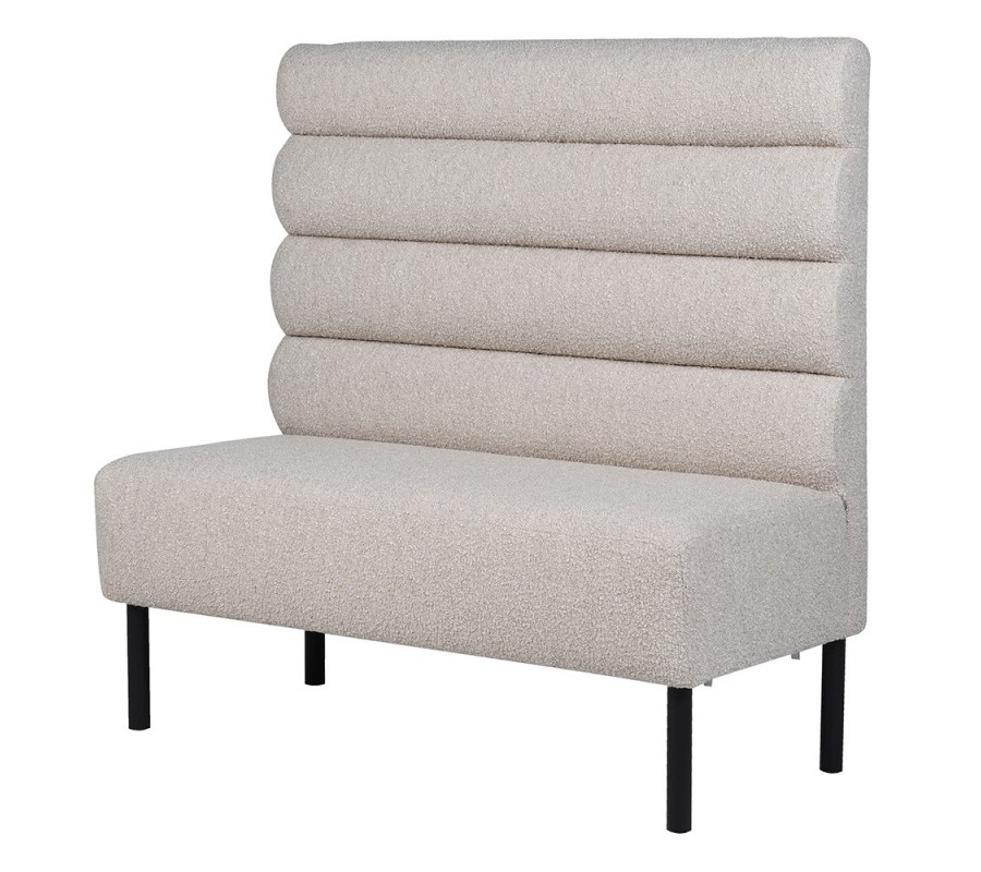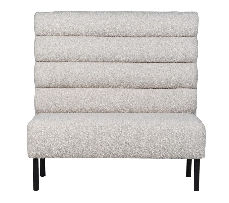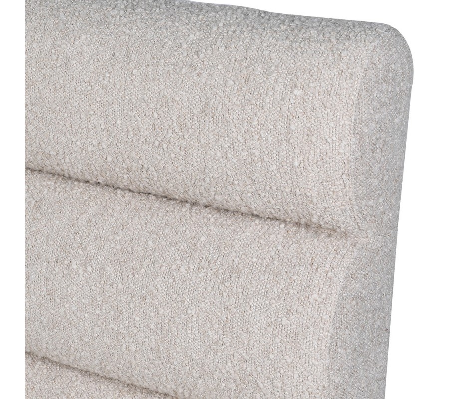Vysoká chrbtová opierka obdĺžnikového tvaru pôsobí masívne a komfortne, pričom jej horizontálne prešívanie v štýle buklé vytvára jemne plastický efekt, ktorý odkazuje na súčasné moderné interiérové trendy.