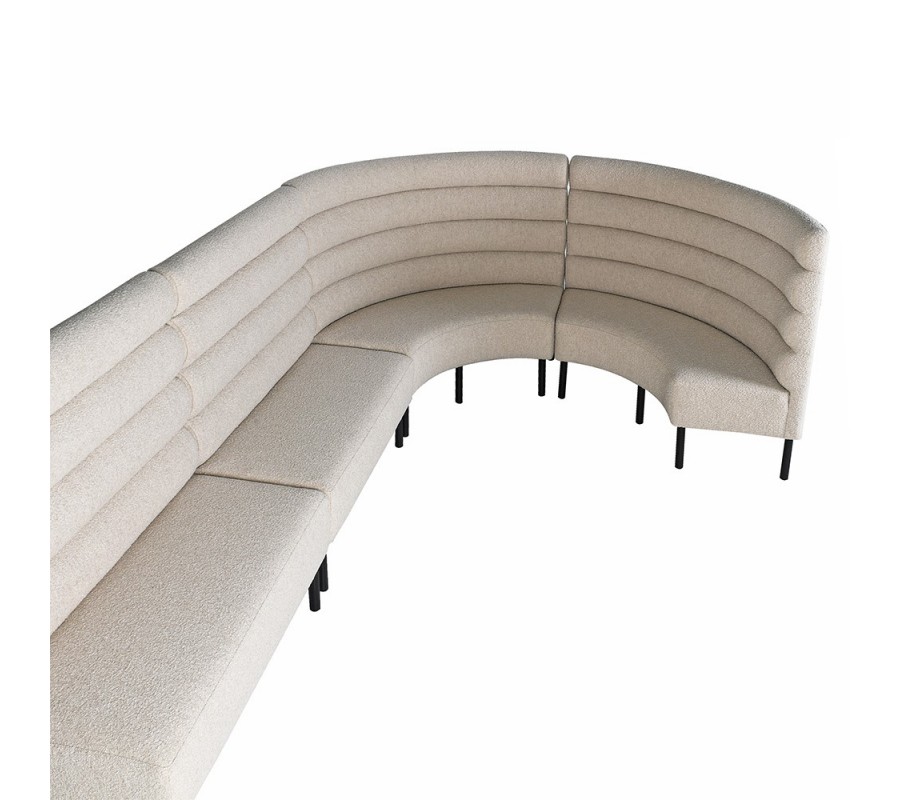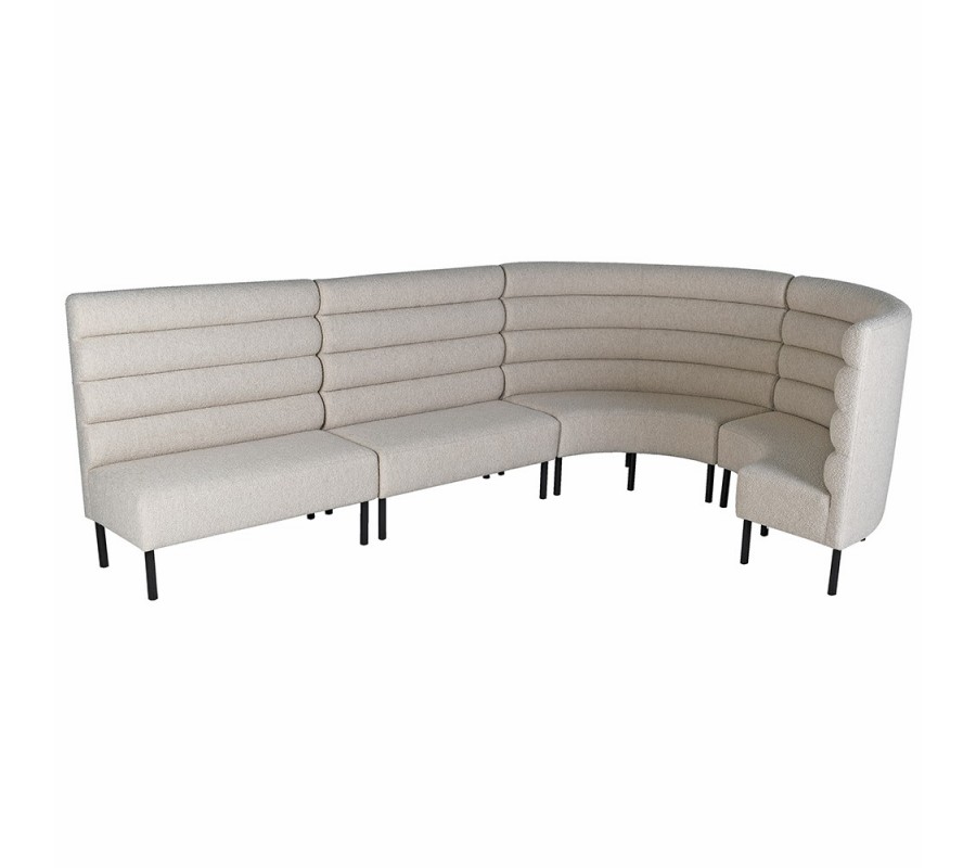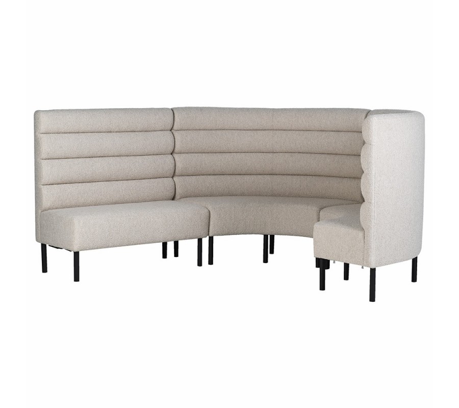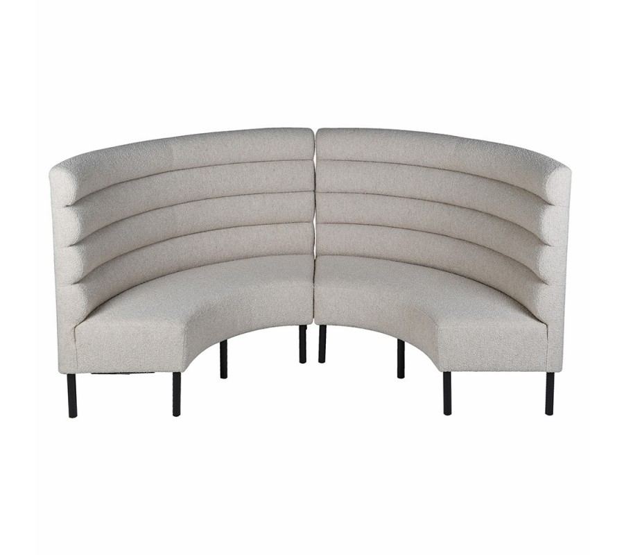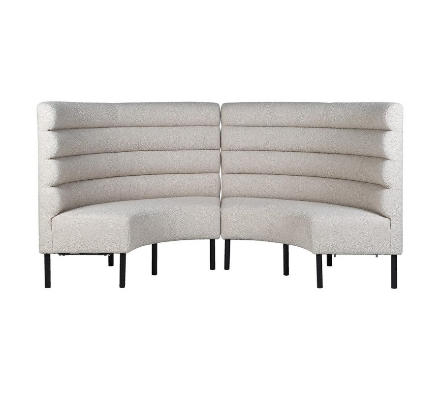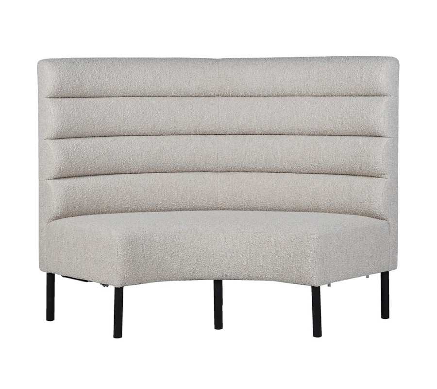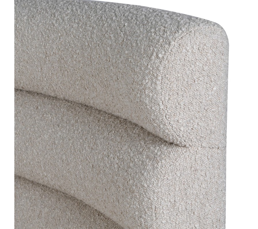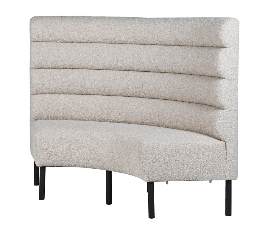 Vysoká chrbtová opierka má poloblúkový, zaoblený tvar, ktorý dodáva lavici jemnosť a plynulosť. Lavica je potiahnutá béžovou textíliou v štýle buklé, horizontálne čalúnenie vytvára plastický vizuálny efekt a nadväzuje na aktuálne trendy v interiérovom dizajne.