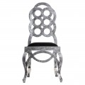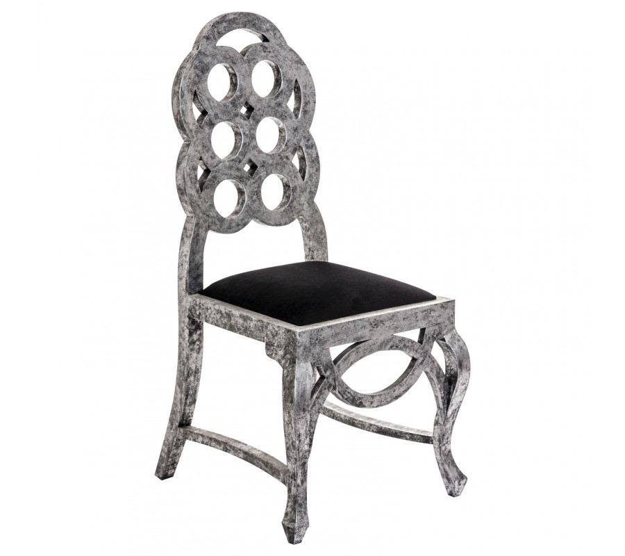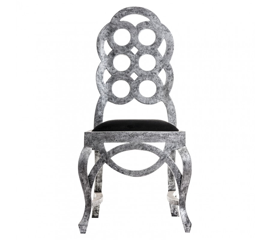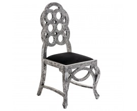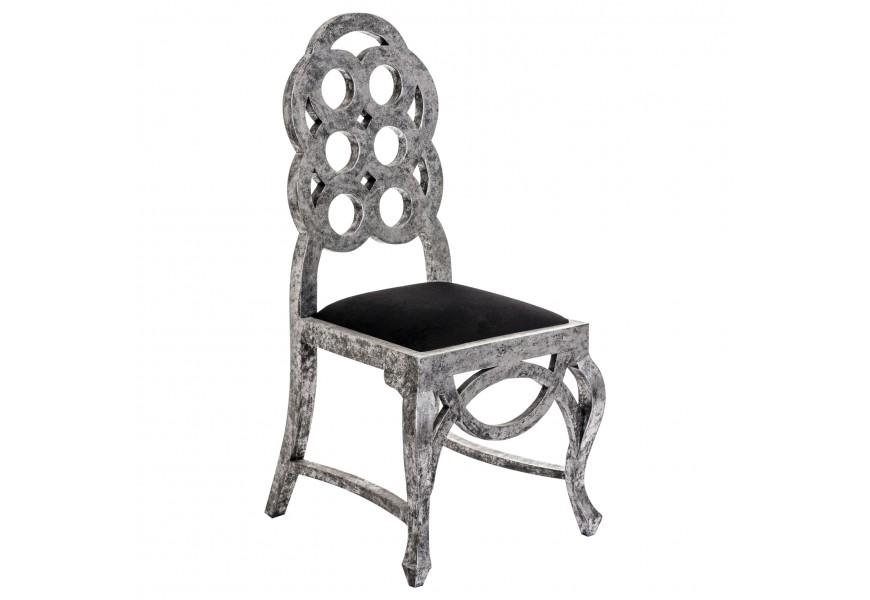 Luxusná stolička PLATA s čiernym čalúnením zaujme svojim strieborne sfarbeným, dreveným telom, ktoré nesie klasické prvky Art-Deco štýlu. Konečný, neprehliadnuteľný vzhľad stoličky dotvára krásne, zamatové sedadlo a štýlová, výrazná patina pokrývajúca celé jej telo. Dodajte svojmu interiéru nádych luxusu v podobe tejto stoličky, ktorá upúta pohľady každej návštevy. Dostupná aj v zlatom prevedení.