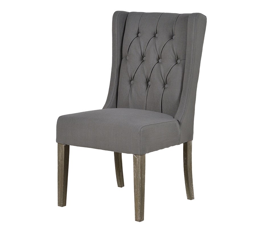 Chesterfield luxusná jedálenská stolička je čalúnená v šedej farbe. Stolička je hladká a príjemná na dotyk. Jej povrch dopĺňajú a obohacujú gombíky, ktoré dodávajú určitú črtu dominancie. Samozrejmosťou sú štyri vysoké drevené nožičky. Vhodnou kombináciou by boli miestnosti zariadené v štýle chesterfield. Celkovo táto jedálenská stolička vyzerá honosne a obohatí Vašu jedáleň.