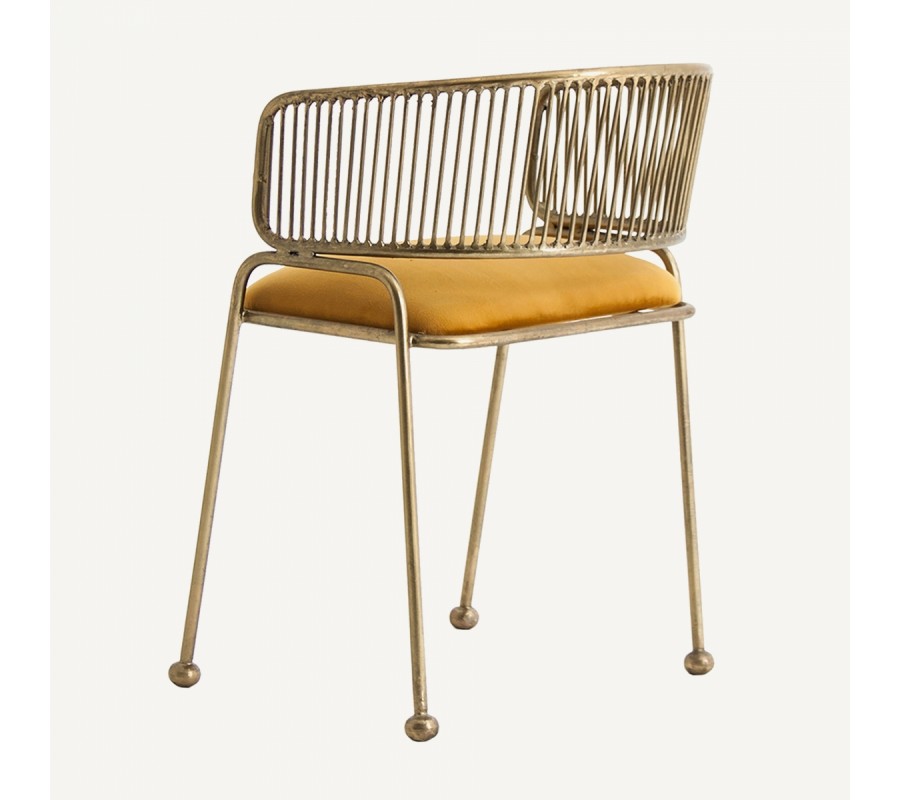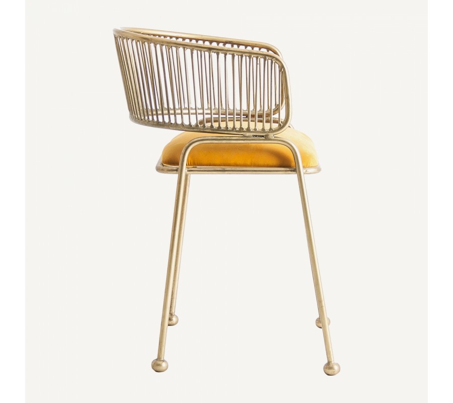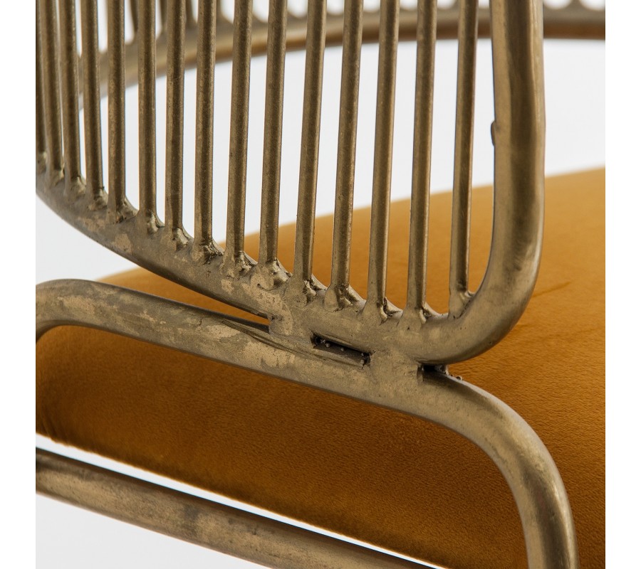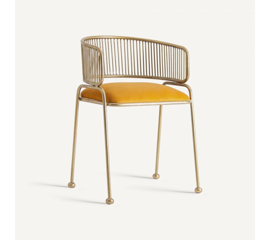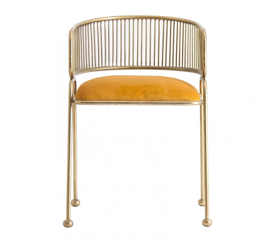 Art-deco dizajnová jedálenská stolička Eugene je vyrobená z kovovej konštrukcie v zlatej farbe. Tvoria ju štyri kovové nožičky, ktoré majú spodok tvaru gule a zabezpečujú celkovú stabilitu stoličky. Podsedáky tvorí mäkká podložka, pohodlná na dlhšie sedenie. Stolička sa dá vhodne kombinovať s inými kontrastnými prvkami a produktmi v škále art-deco. Môže sa použiť buď ako jedálenská stolička, alebo do baru, kaviarne, vďaka jej odolným kovovým nohám. Celkovo pôsobí jasne, rozžiari a obohatí Váš interiér.