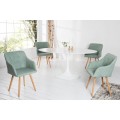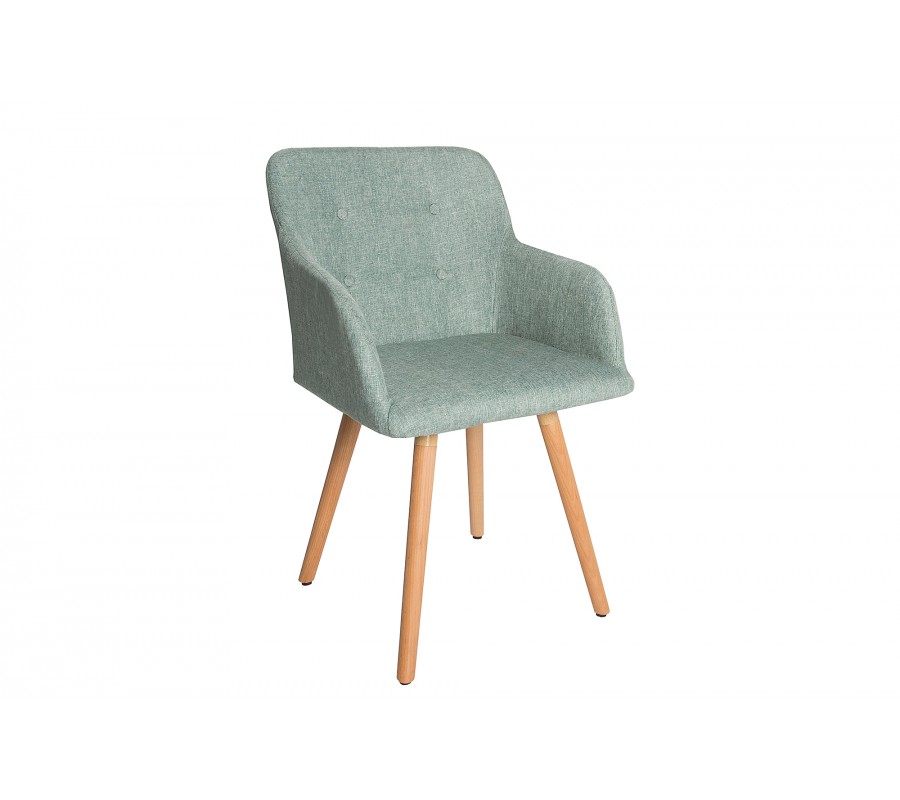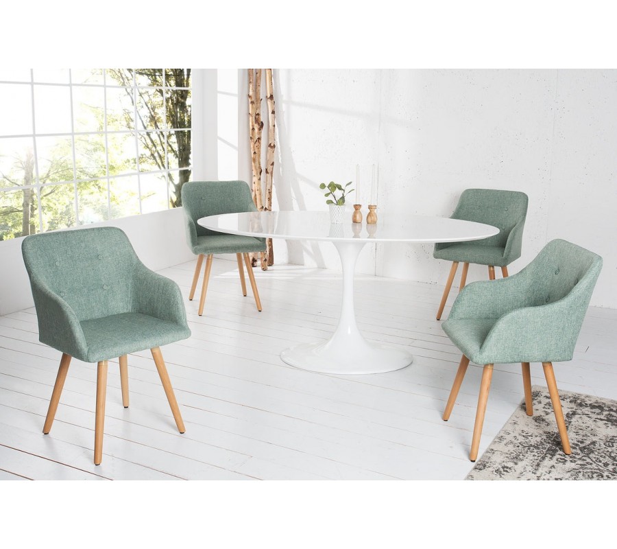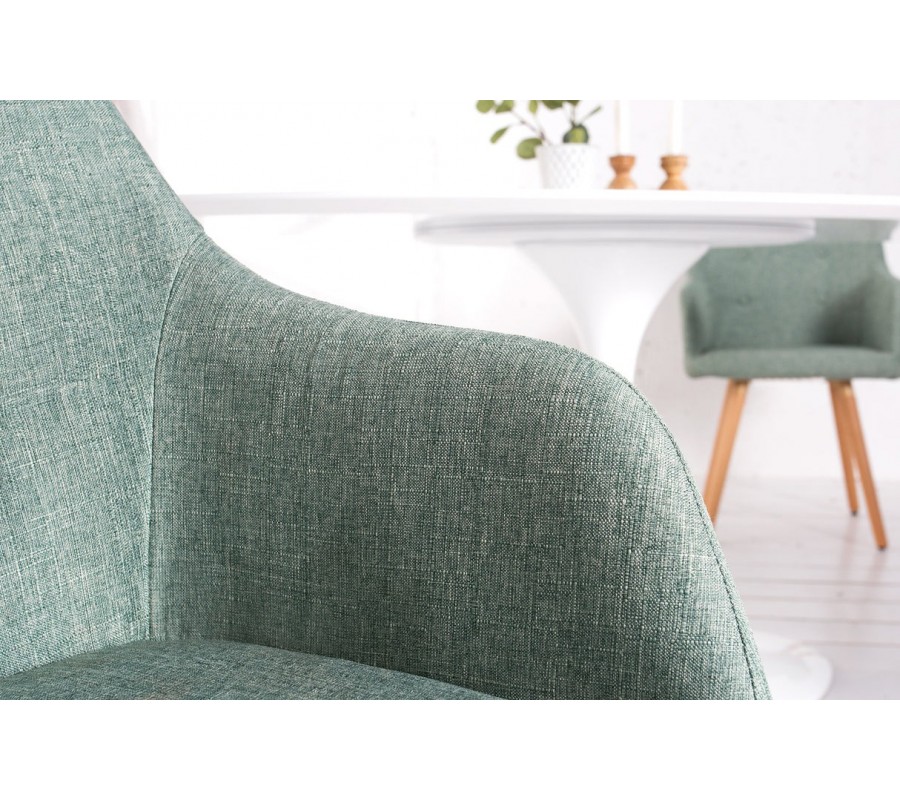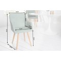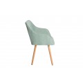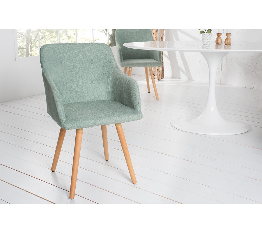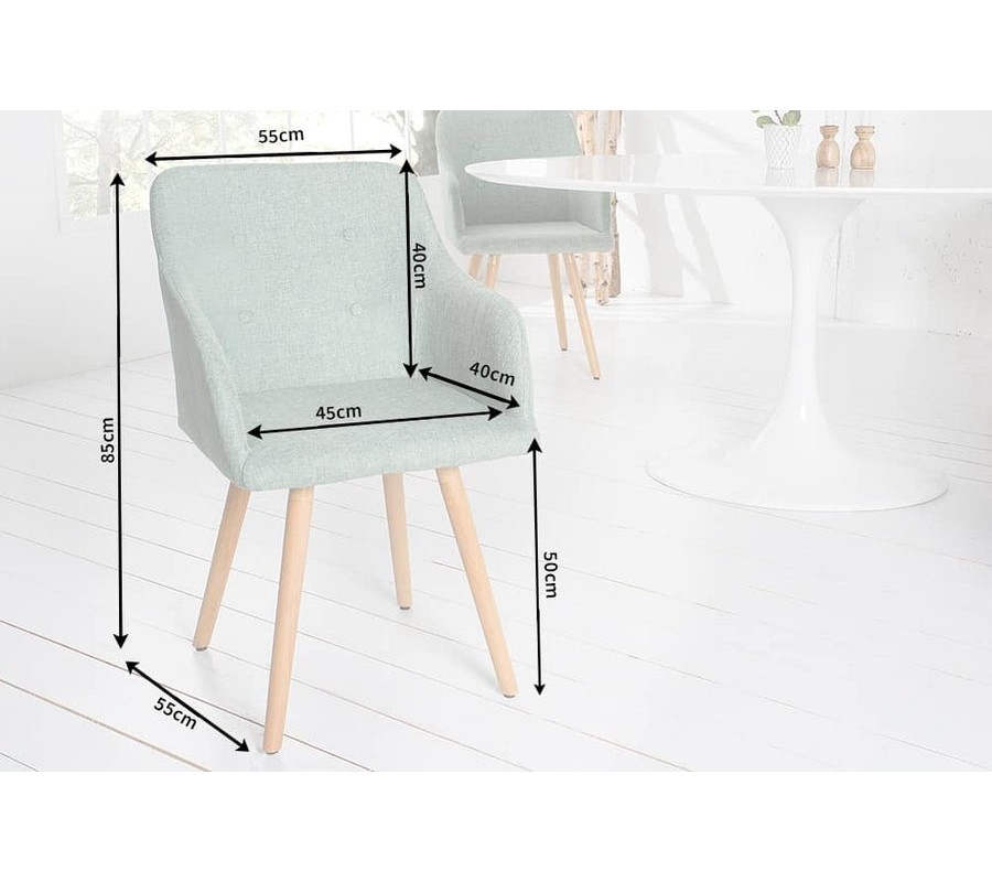Jedálenská stolička Scandinavia je harmonickým spojením škandinávskej čistoty a retro detailov, ktoré dodávajú interiéru sviežosť a jemný dizajnový akcent. Stolička je potiahnutá svetlo zeleno-modrou textíliou s jemnou tkanou štruktúrou, ktorá pôsobí prirodzene a pohodlne. Čalúnené operadlo je ozdobené decentným prešívaním so štvoricou gombíkov, ktoré jemne odkazuje na retro štýl 60. rokov.