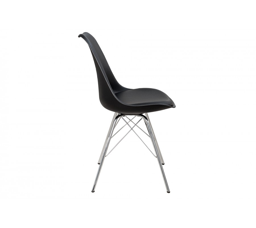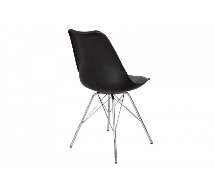 Jedálenská stolička Scandinavia spája retro dizajn s harmonickým škandinávskym štýlom. Spojenie čiernej farby a chrómových detailov je univerzálne a stoličku tak ľahko zakomponujete do širokého spektra interiérov.