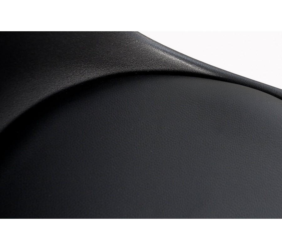 Stolička má okrúhle sedadlo, ku ktorému sa v zadnej časti napája chrbtová opierka s rovnou vrchnou hranou. Mierne presahuje na bočné strany a jej tvar je jemne prehnutý, čo zabezpečuje maximálny komfort pri sedení. Sedadlo je čalúnené a potiahnuté ekokožou v čiernej farbe. Tento materiál je odolný a nenáročný na údržbu, čo je ideálne pre nábytok s každodenným využívaním. Chrbtová opierka je vyrobená z pevného plastu s výraznou matnou štruktúrou, korešpondujúcou s poťahom sedadla.