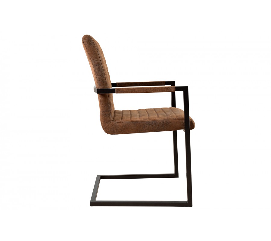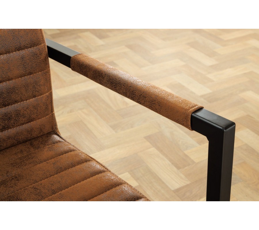 Zaujímavým detailom sú aj bočné opierky na ruky, ktoré sú potiahnuté rovnakým hnedým mikrovláknom – avšak v podobe napnutej látky bez čalúnenia, čím vzniká kontrast medzi mäkkosťou a technickým vzhľadom.