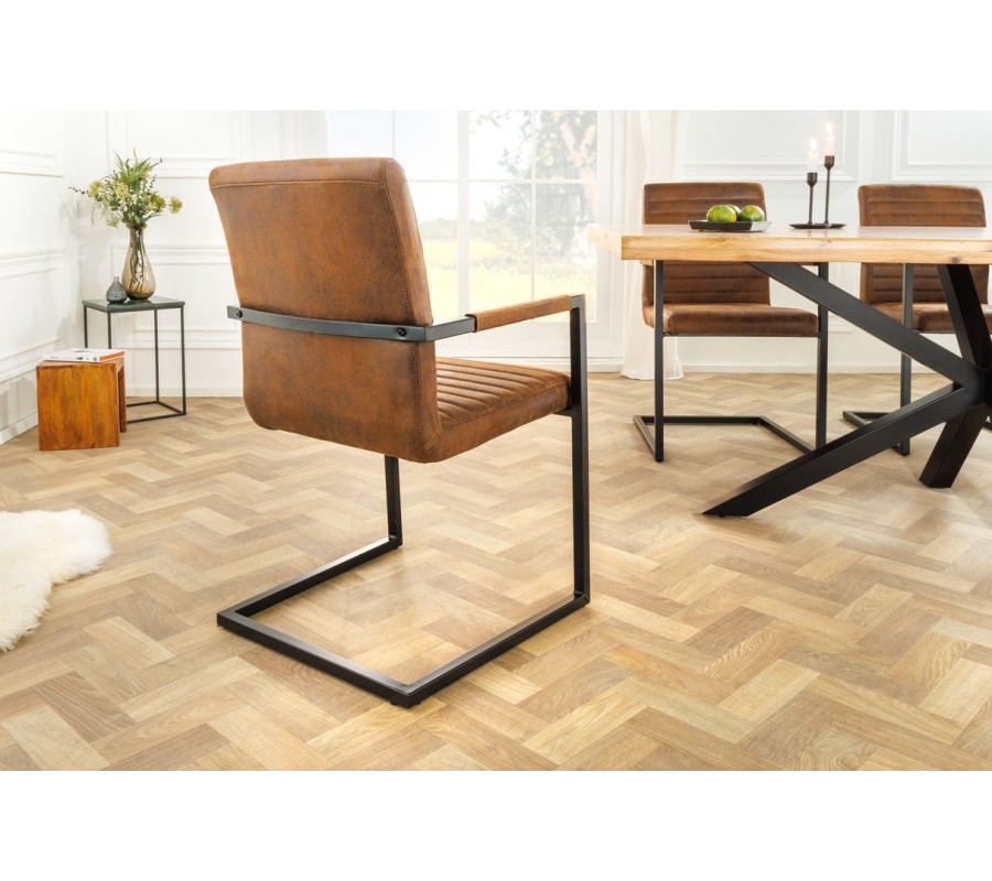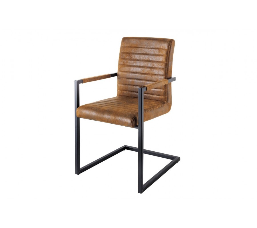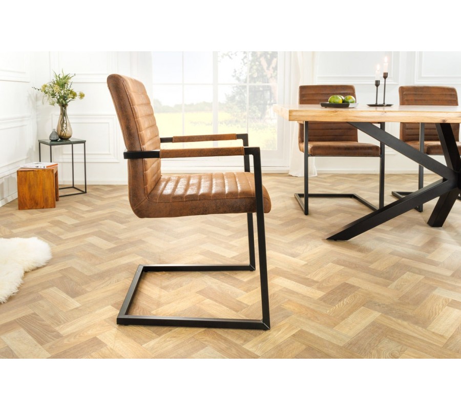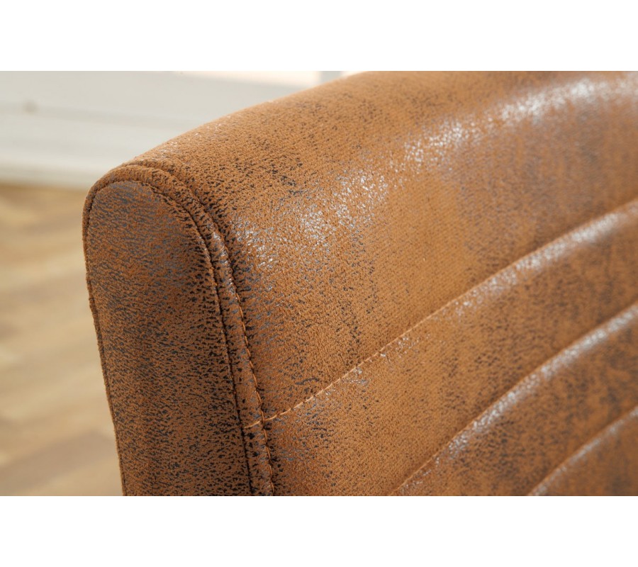 Stolička Imperial zaujme moderným industriálnym dizajnom a zároveň ponúka vysoký komfort. Jej čalúnené sedadlo a operadlo sú potiahnuté hnedou eko kožou s vintage efektom s jemným leskom a horizontálnym dekoratívnym prešívaním, ktoré dodáva stoličke vizuálnu hĺbku aj štruktúru.