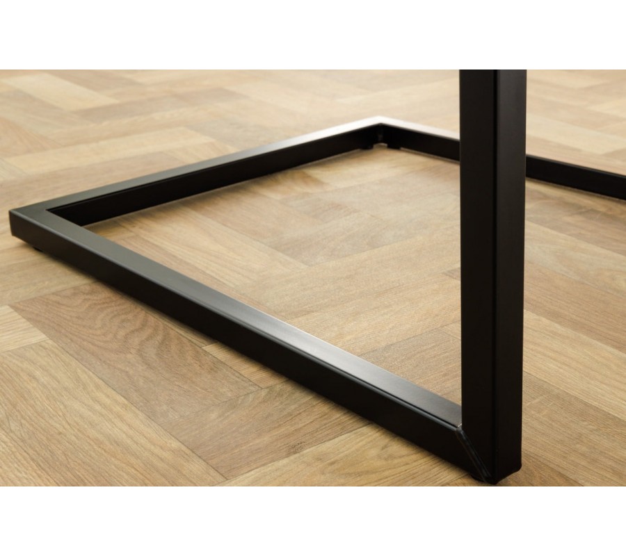 Kovová konštrukcia je vyrobená z hranatých čiernych tyčí a tvorí elegantnú konzolovú podstavu v tvare písmena U, ktorá zabezpečuje stabilitu aj estetickú ľahkosť. Stolička má dve predné nožičky, ktoré smerom nadol prechádzajú do základne, čo vytvára vizuálne zaujímavý a zároveň pevný rám.