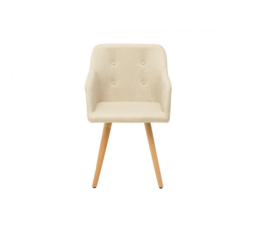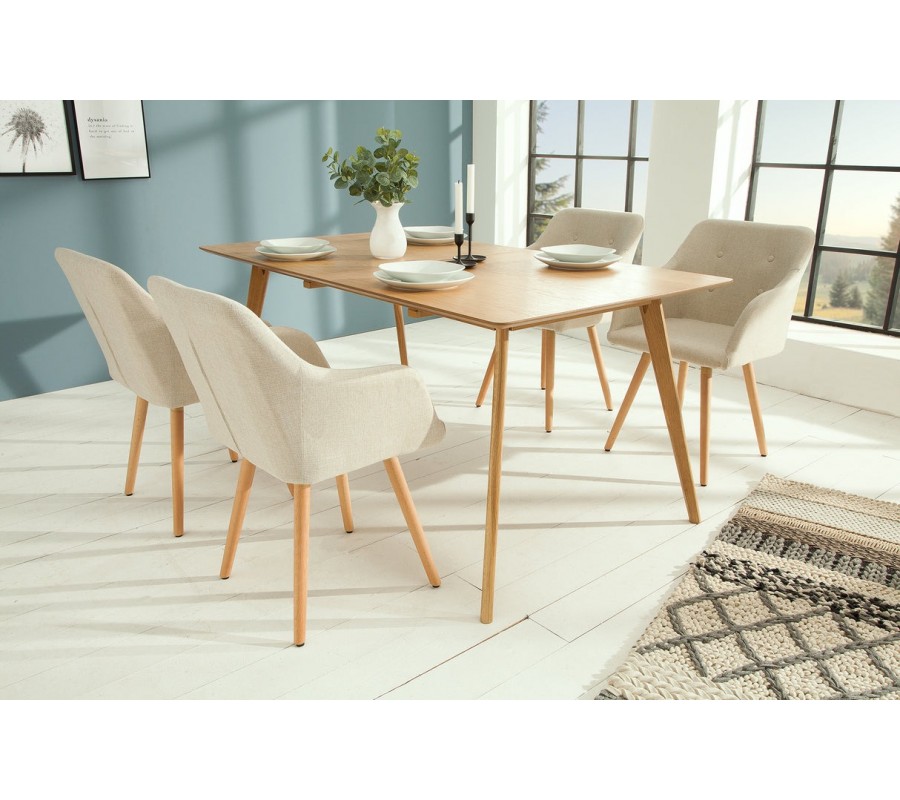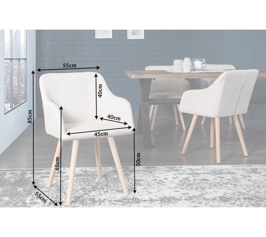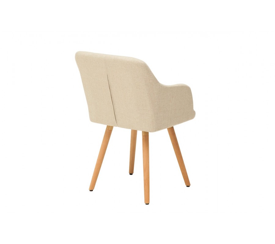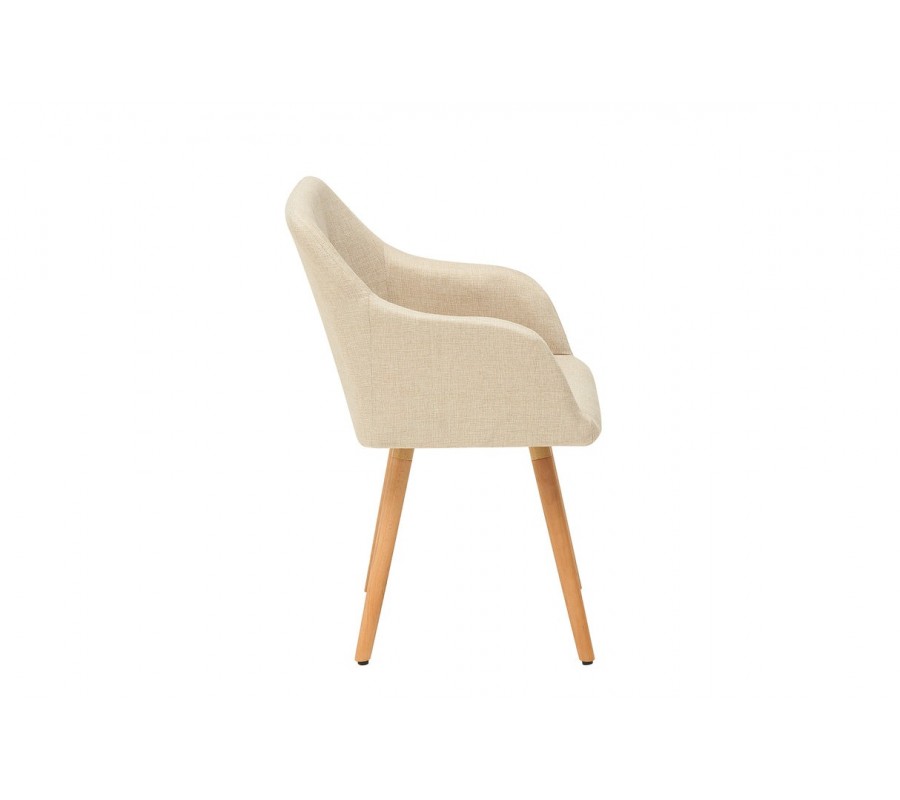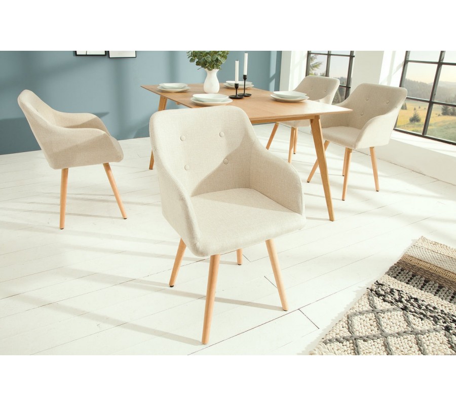 Dizajnová škandinávska čalúnená krémová jedálenská stolička Scandinavia s opierkami na ruky a masívnymi hnedými nohami 85 cm
