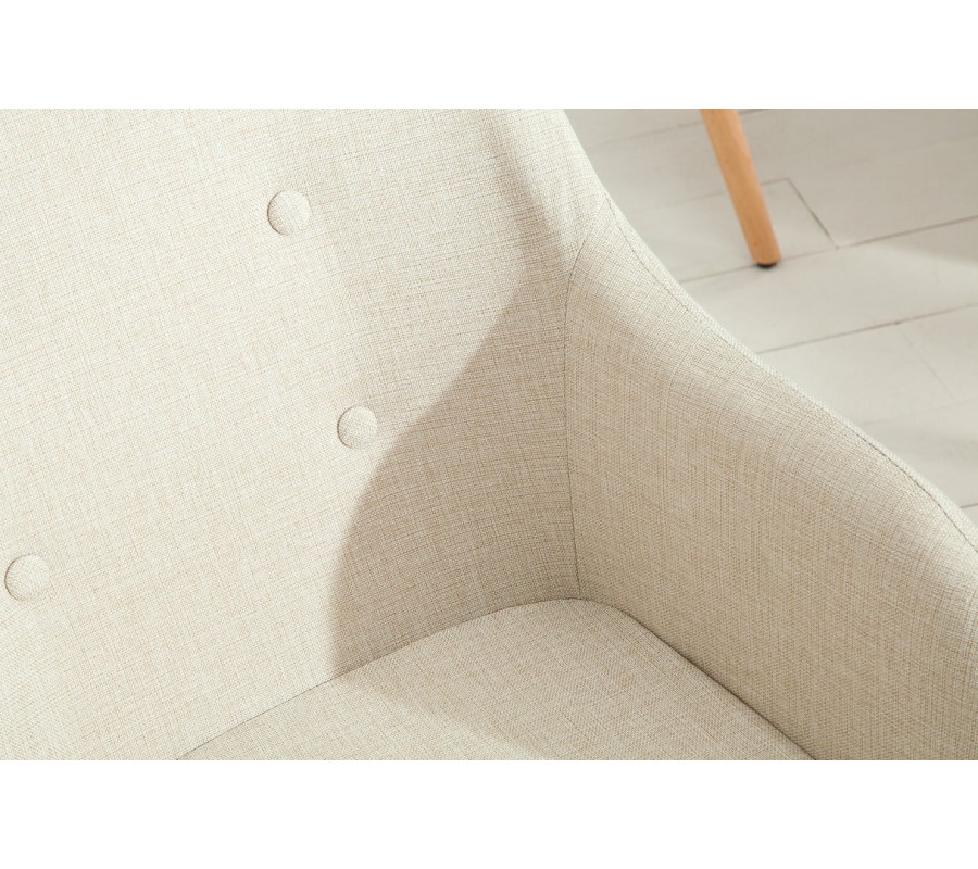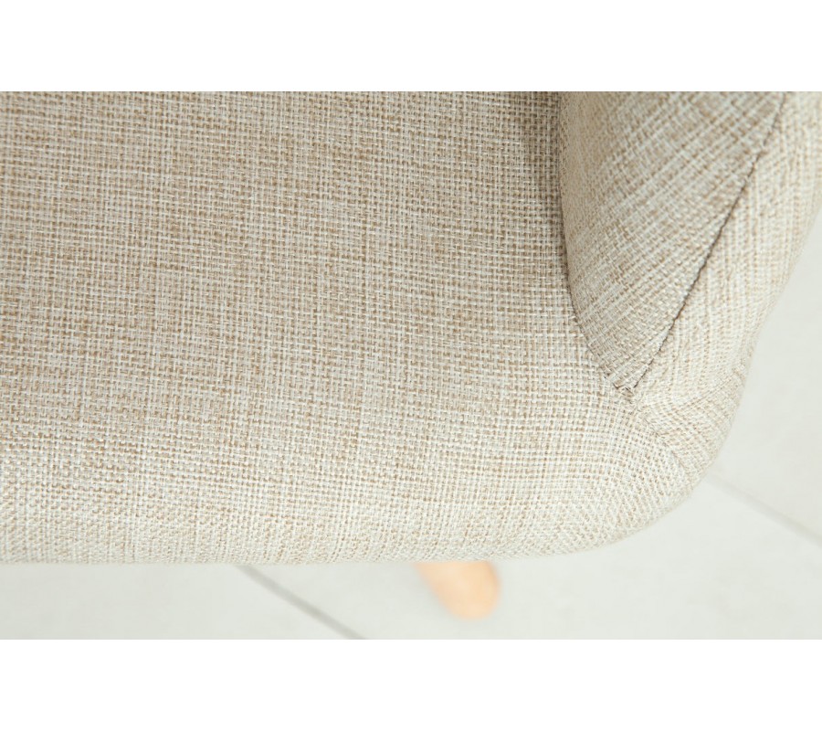 Konštrukcia je vyrobená z masívneho dreva, ktorého svetlá hnedá farba s jemnou kresbou letokruhov je odhalená na nožičkách. Sedadlo a opierky pokrýva penová výplň a textilný béžový poťah z výrazným tkaním. Drobné odchýlky vo farebnosti vytvárajú organický vizuál a mikrovlákno zaručuje vysokú odolnosť voči vplyvom každodenného používania. Látka je zároveň nenáročná na údržbu. Vnútornú stranu opierky zdobia štyri okrúhle gombíky, ktoré tvoria minimalistický akcentový prvok.