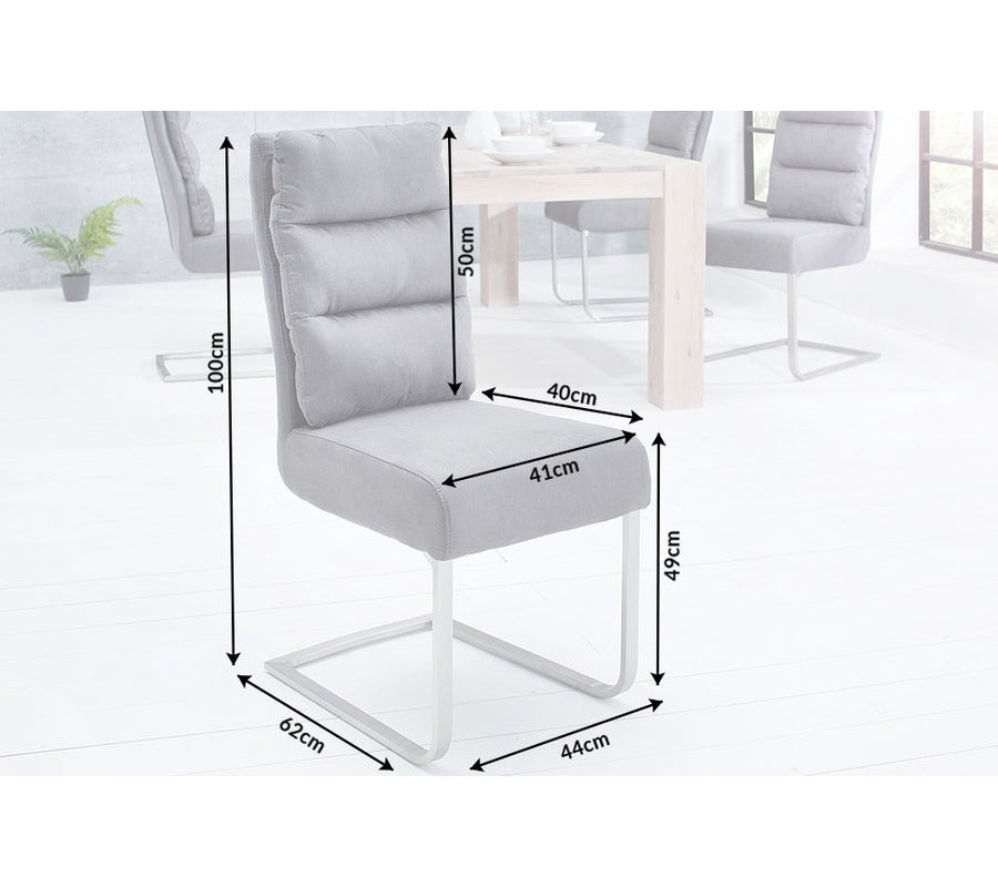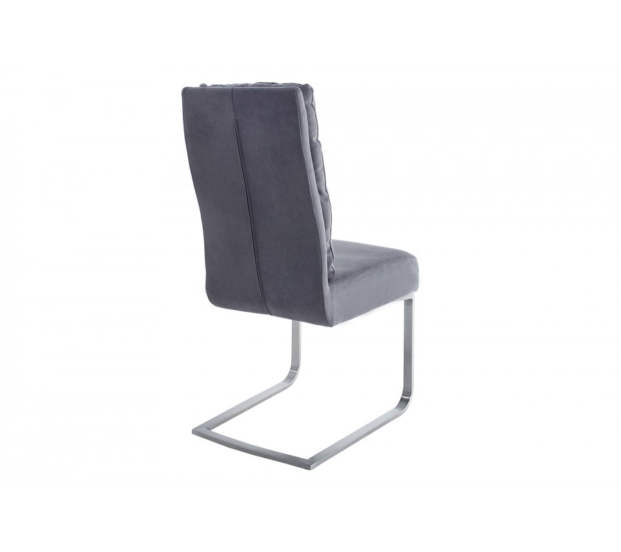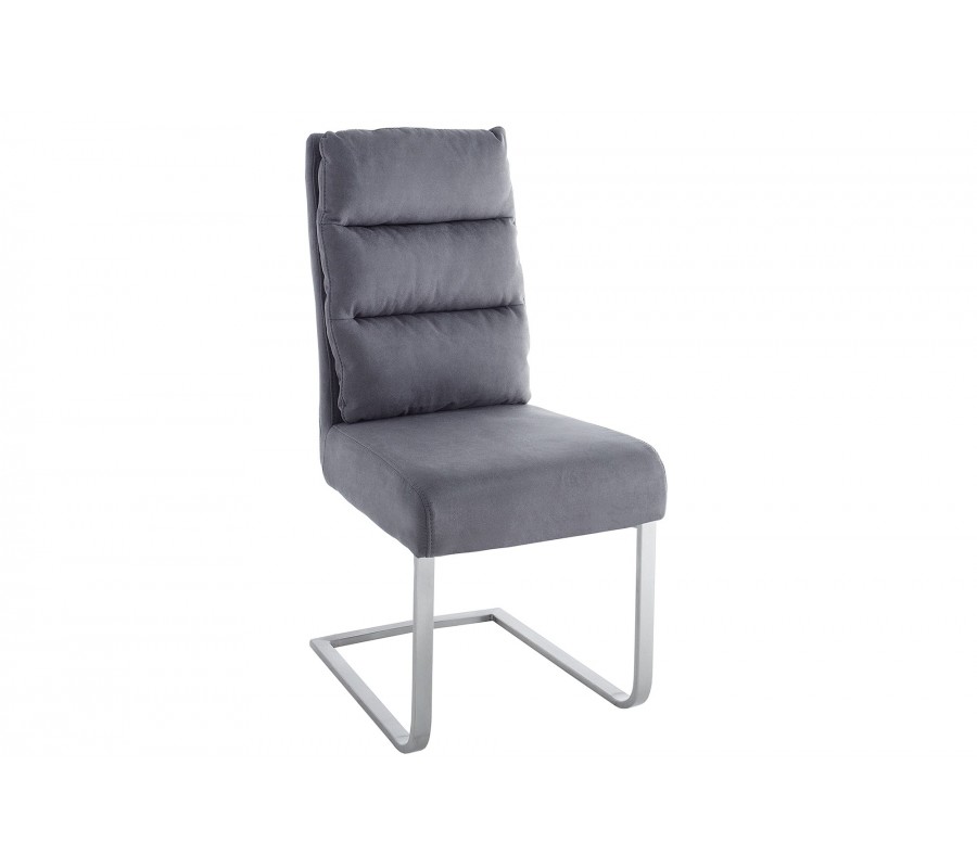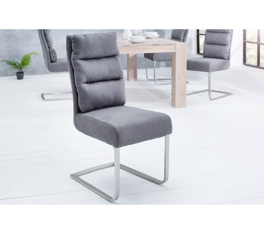 Jedálenská stolička Liron v modernom dizajne kombinuje čisté línie, elegantný čalúnený povrch v sivej farbe a minimalistickú konštrukciu bez bočných opierok. Mäkké sedadlo a vysoké operadlo s výrazným horizontálnym prešívaním zabezpečujú pohodlné sedenie aj počas dlhších večerí. Poťah je z mikrovlákna, ktoré je pevné a má ľahkú údržbu.
