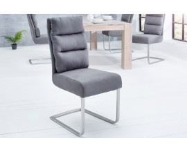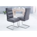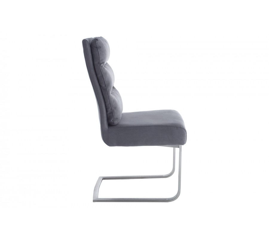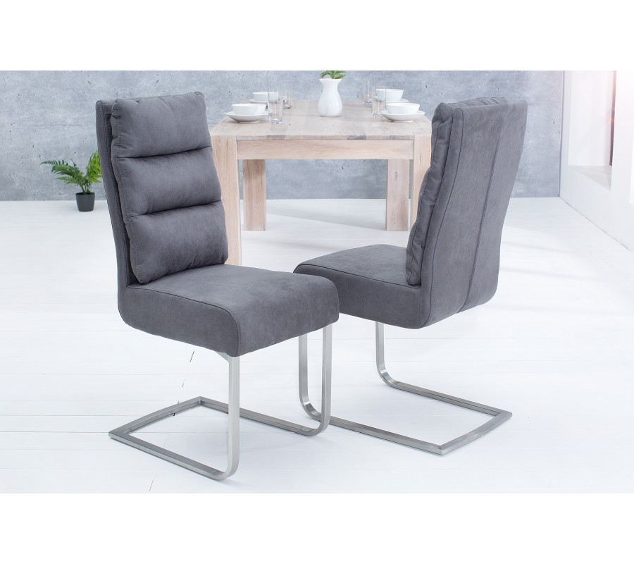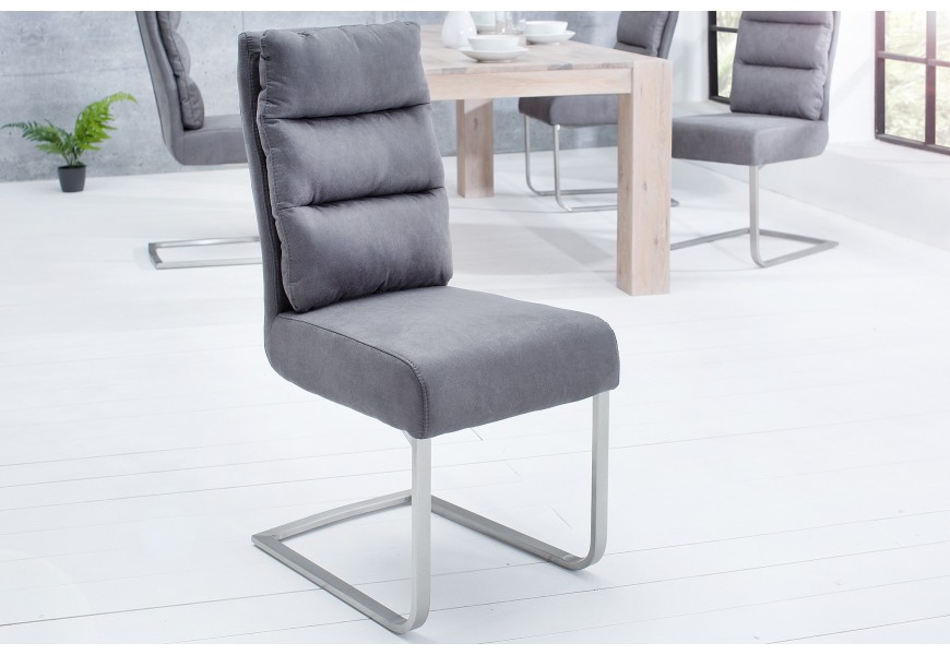 Jedálenská stolička Liron v modernom dizajne kombinuje čisté línie, elegantný čalúnený povrch v sivej farbe a minimalistickú konštrukciu bez bočných opierok. Mäkké sedadlo a vysoké operadlo s výrazným horizontálnym prešívaním zabezpečujú pohodlné sedenie aj počas dlhších večerí. Poťah je z mikrovlákna, ktoré je pevné a má ľahkú údržbu.