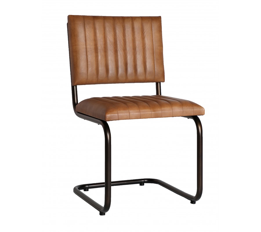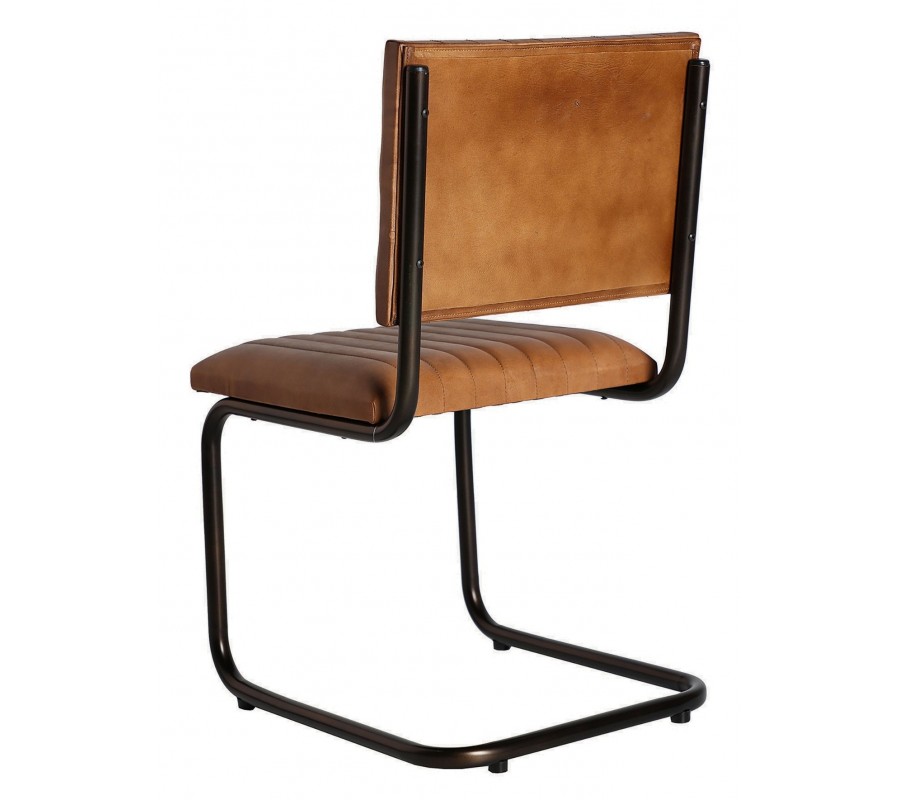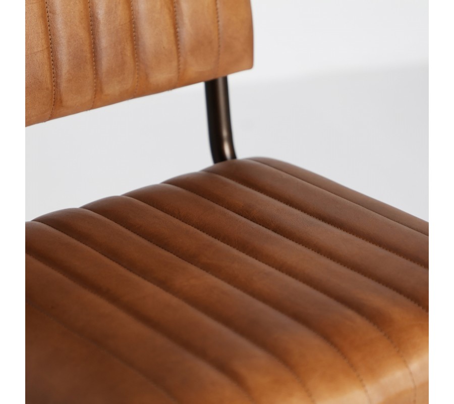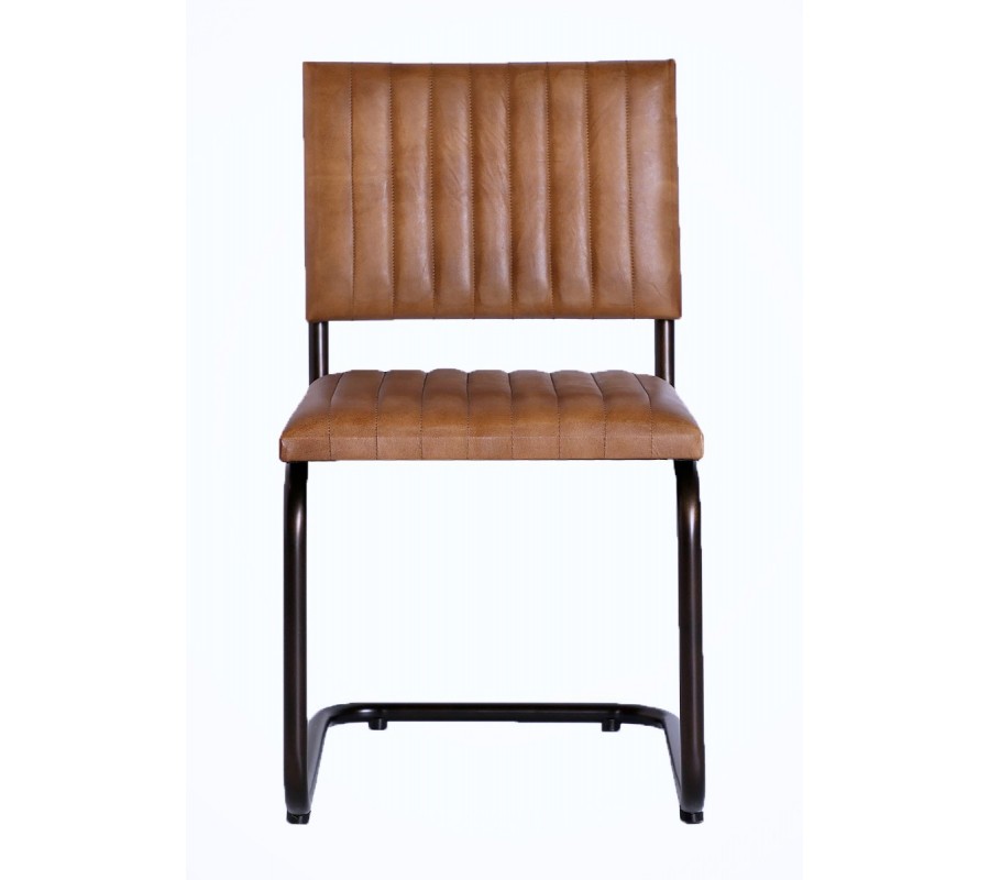 Pracovná stolička Zimbia zaujme kombináciou industriálneho štýlu a prvotriedneho komfortu. Má oblé kovové nožičky s matným čiernym povrchom, ktoré vytvárajú konzolový tvar bez zadných nôh, čím pôsobí moderne a odľahčene. Sedacia časť a operadlo sú čalúnené kvalitnou pravou kožou v príjemnom hnedom odtieni, ktorý vynikne najmä v kombinácii s tmavým kovom.