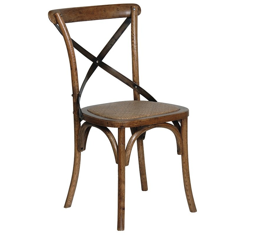 Stolička je vyrobená z brestového dreva, ktoré je veľmi tvrdé a zaručí vám výbornú odolnosť nábytku. Drevený rám má pôvabnú siluetu inšpirovanú vidieckym nábytkom. Nožičky sú jemne prehnuté a zadné prechádzajú až do bočných línií chrbtovej opierky. Na vrchole ich prepája oválne operadlo, ktoré je tiež mierne zakrivené, vďaka čomu sa môžete pohodlne oprieť. Pod sedacou časťou sa na každej strane nachádza poloblúková spojnica nožičiek. Chrbtovú opierku vypĺňa prvok v tvare X, ktorý dodáva stoličke vizuálne dominantný prvok.