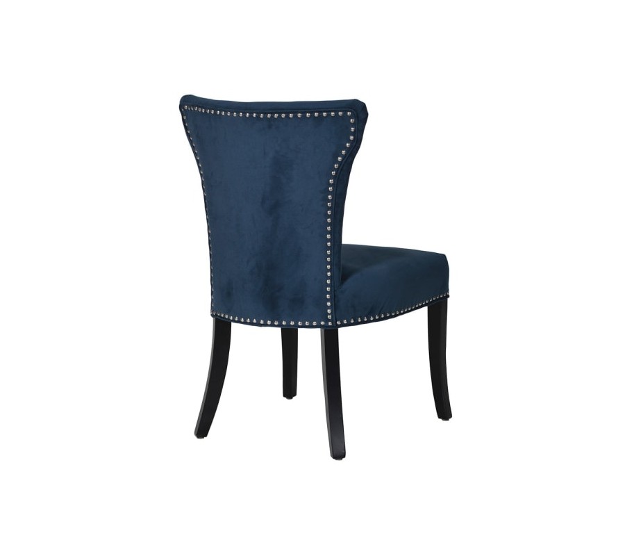 Na prvý pohľad vás upúta nádherný tmavomodrý odtieň poťahu. Zamatový finiš mu dodáva lesk a stolička tak pôsobí luxusným dojmom. Podčiarkuje ho ešte vybíjané zdobenie striebornými kovovými nitmi na chrbtovej opierke a v spodnej časti stoličky. Vytvára svetlý vizuálny predel medzi tmavšou sedacou časťou a čiernymi nožičkami a taktiež zdôrazňuje siluetu opierky v zadnej časti.