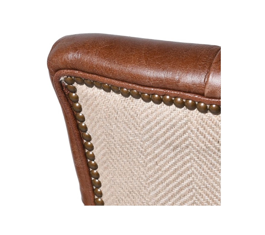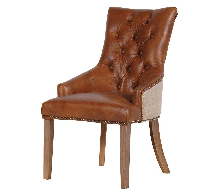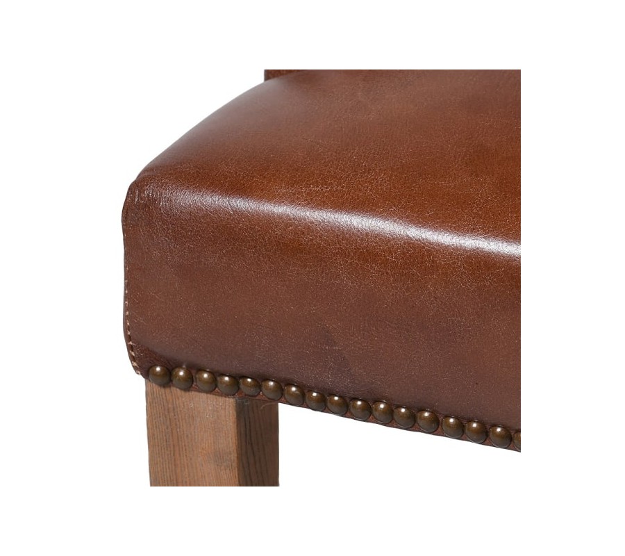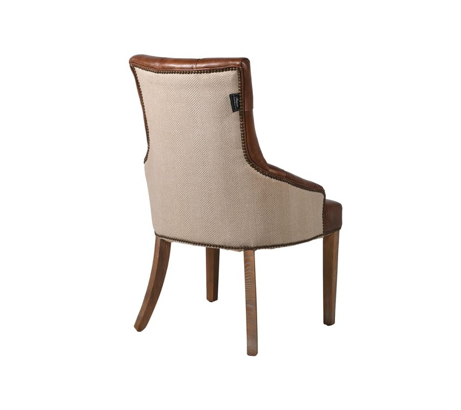 Pohodlné čalúnenie jedálenskej stoličky CHSTERFIELD pozostáva z kvalitnej hnedej kože z prednej strany a z prírodného ľanového poťahu na zadnej strane. Kožená časť vyniká svojou prirodzenou patinou, ktorá je umocnená nadčasovým prešívaním v Chesterfield štýle a vytvára tak dokonalé pohodlie aj počas dlhého sedu. Dekoratívny charakter stoličky dopĺňajú autentické sponky po obvode čalúnenia. Jednoduché hranaté nohy sú vyrobené z dubového dreva a nesú sa v odtieni hnedého koženého poťahu. Okrem použitia pri jedálenských stoloch, stolička dokonale vynikne aj v reprezentatívnych priestoroch firiem či v štýlových kluboch a reštauráciách.