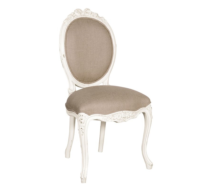 Dizajnová provence jedálenská stolička Antic Blanc s pohodlným, tmavo béžovým čalúnením, v kontraste s bielym dreveným základom, s očarujúcimi dekoratívnymi prvkami. Je vyrobená z masívneho mahagónového dreva, čím je zaručená jej odolnosť. Doplňte ho o ďalšie kusy tejto štýlovej kolekcie nábytku Antic Blanc.