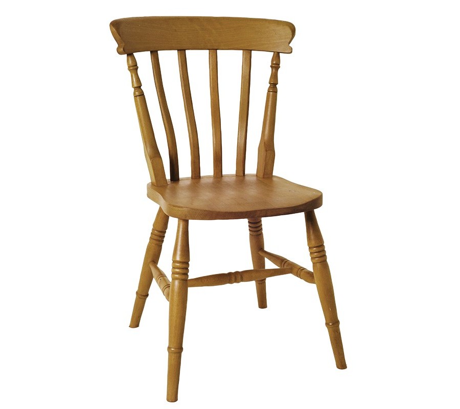 Charakteristickým prvkom je zaoblené operadlo, ktoré sa smerom nahor elegantne rozširuje a poskytuje príjemnú oporu. Zvislé tyče sú dekoratívne vyrezávané a tvoria výrazný detail, ktorý podčiarkuje remeselný charakter stoličky. Sedacia časť je mierne zaoblená, čo zvyšuje komfort pri sedení, zatiaľ čo šikmé nožičky so zdobením vo forme frézovania pôsobia pevne a esteticky vyvážene. Spojnica medzi nohami zvyšuje stabilitu konštrukcie a zároveň dodáva stoličke autentický dobový výraz.