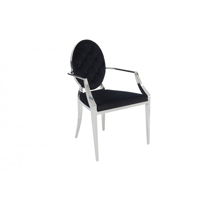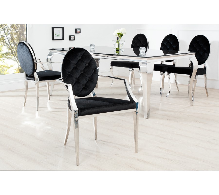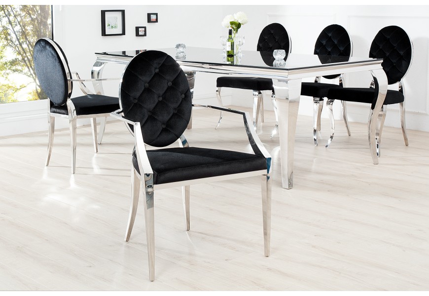 Luxusná jedálenská stolička Modern Barock II s opierkami v čiernom prevedení je prekrásnym doplnkom k jedálenskému stolu z kolekcie dizajnového nábytku Modern Barock. Nábytok tejto kolekcie je vyrábaný z leštenej nerezovej ocele v klasickom barokovom prevedení, vďaka ktorému získava originálnu podobu. Materiál: kov, polyester.