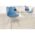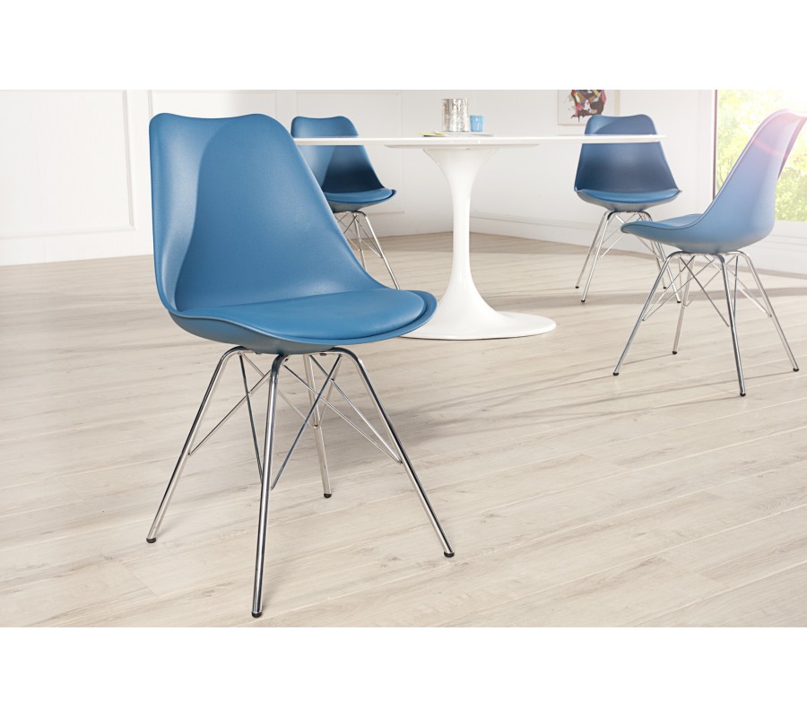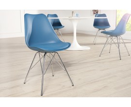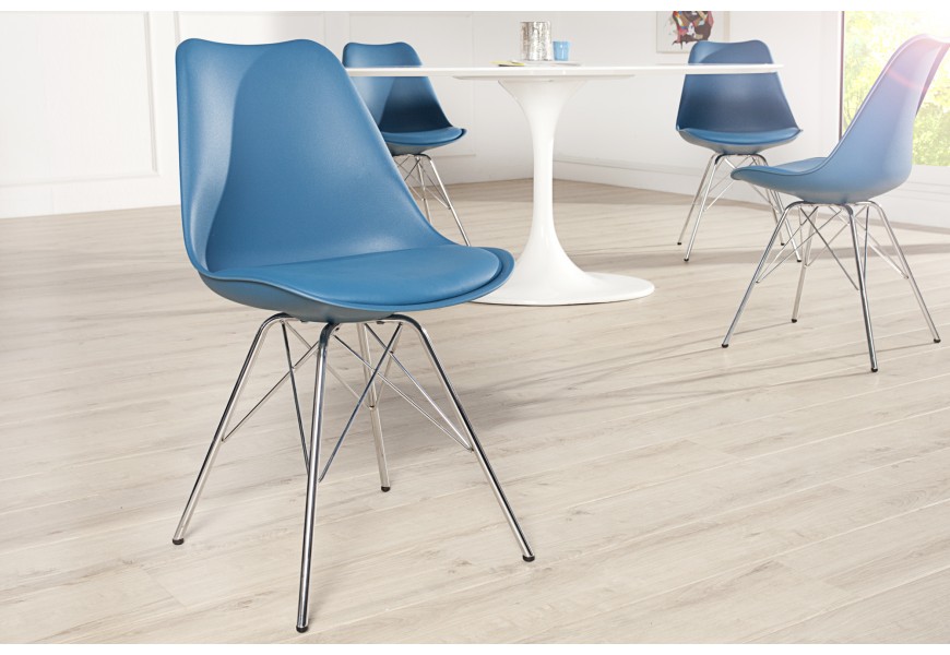 Štýlová modrá stolička Scandivania Retro je stolička vo výrazných veselých farbách, ktoré rozžiaria každú miestnosť. Vďaka svojmu retro dizajnu, sa hodí do retro zariadených interiérov, ale neublíži ani v moderných miestnostiach. Stolička má pochrómované kovové nohy, čo im dodáva unikátny lesk. Ostatné časti stoličky sú vyrobené z polyuretánu. Stolička ponúka nielen štýlový dizajn, ale aj pohodlné sedenie vďaka vystuženému sedadlu s imitáciou kože.