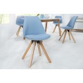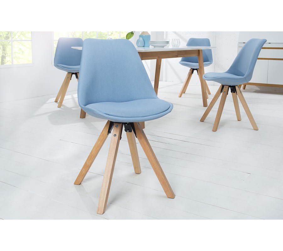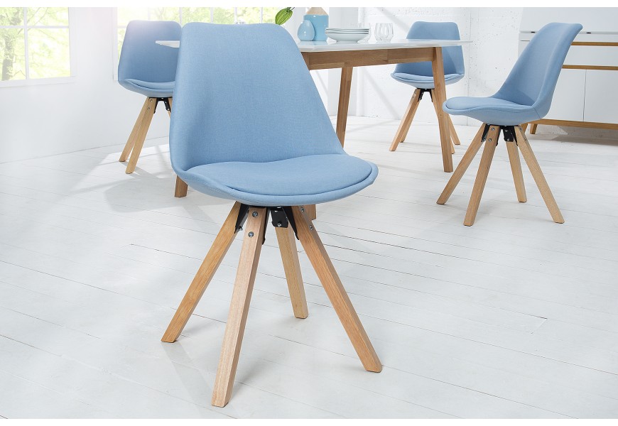 Dizajnová stolička Scandinavia Struktur v štýlovom modrom prevedení v retro dizajne. Stolička je v kombinácii svetlo modrej farby so svetlým drevom, čo pôsobí upokojujúcim a útulným dojmom. Vhodná je do takmer každého interiéru. Rozveselí interiér farbami a dá Vašej miestnosti nový nádych. Stolička je očarujúcim kúskom, ale aj pohodlnou vďaka textilnej vystuženej časti na sedadle aj zadnej opierke. Je ručne vyrbaná, preto je každý jeden kúsok jedinečný a môže sa líšiť od obrázka. Je vyrobená z masívneho a recyklovaného dreva.