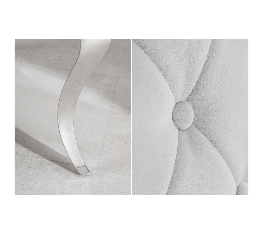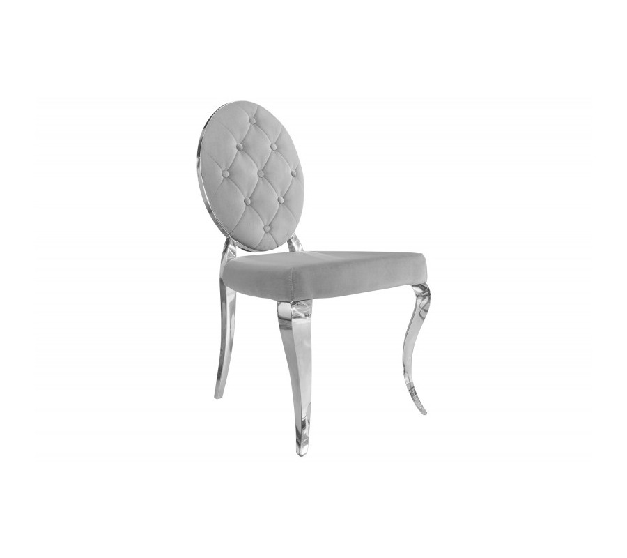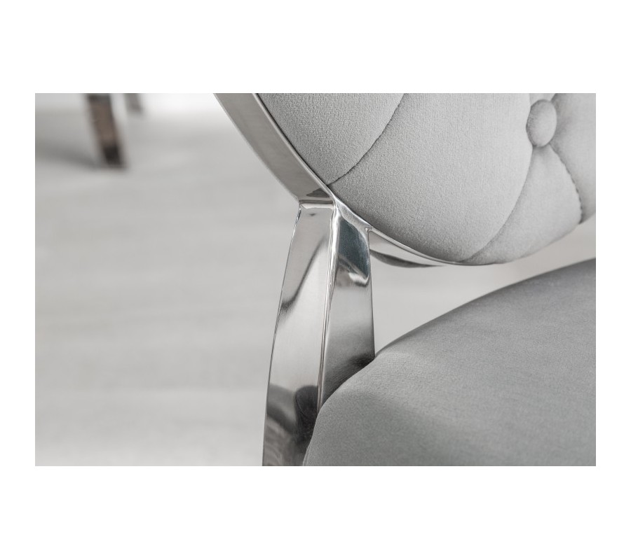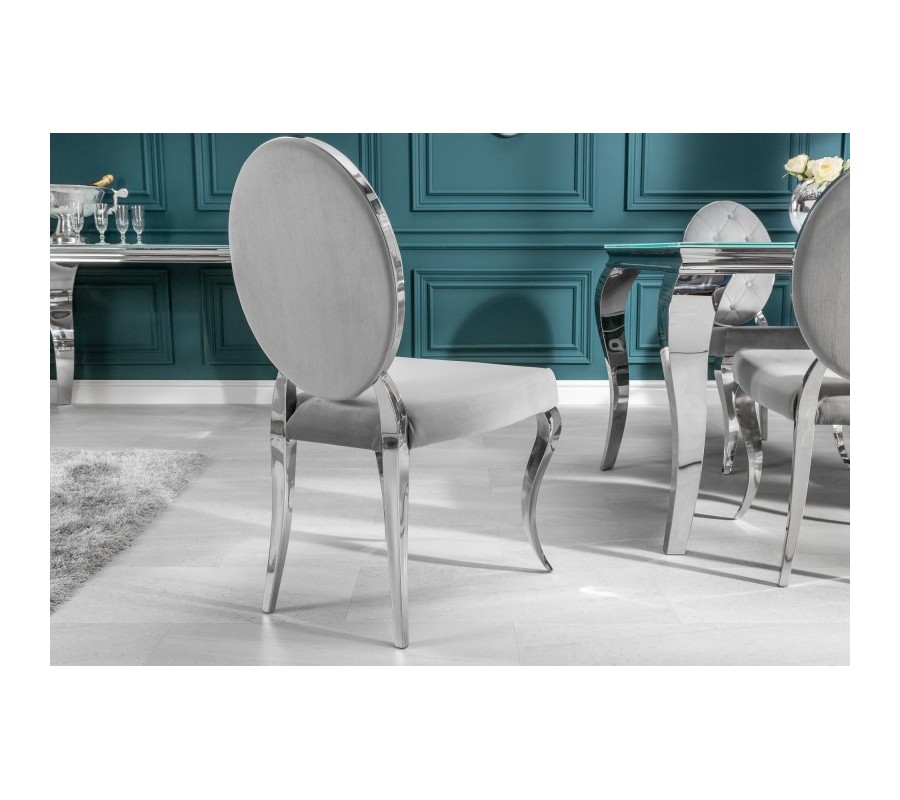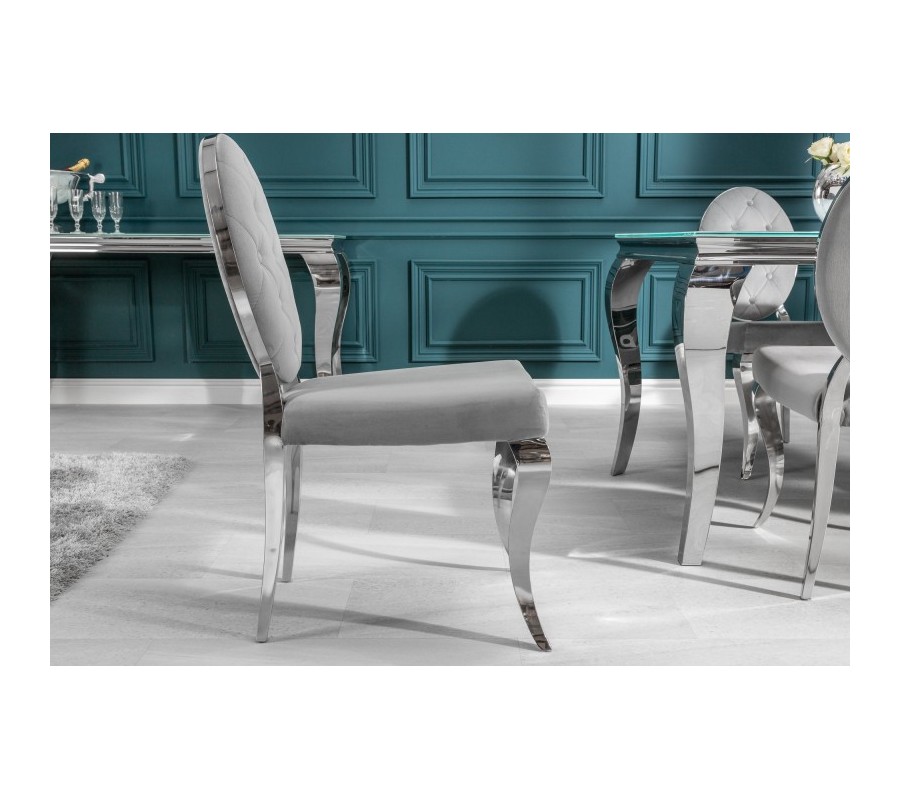 Luxusná jedálenská stolička z kolekcie nábytku Modern Barock je ideálnym doplnkom k jedálenským stolom. Leštená nerezová oceľ spolu s prekrásnym čalúnením utvára dokonalý kúsok kombinujúci moderné prevedenie s klasickým barokovým dizajnom. Celá stolička je vyrobená z lesklej nerezovej ocele, čo v kombinácii so sivým poťahom tvorí elegantný dizajn, ktorý dodá interiérom prepychový vzhľad.